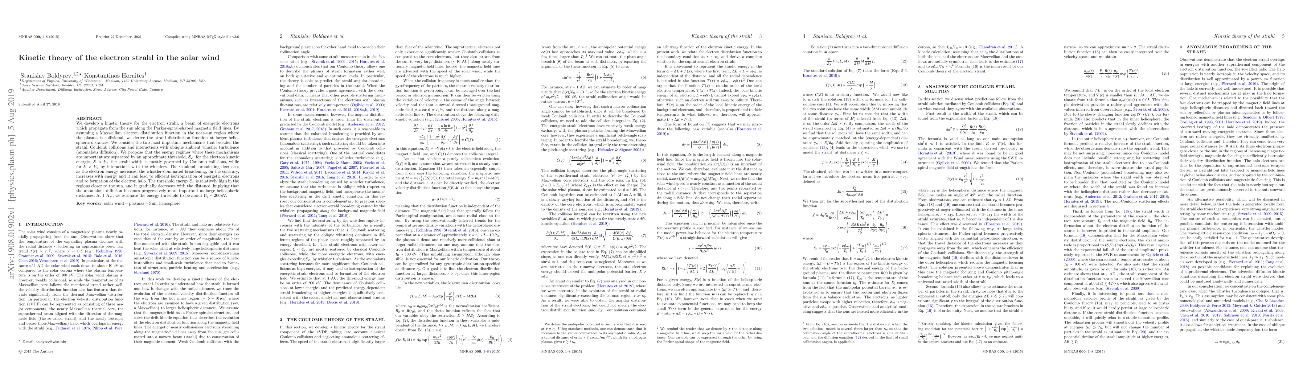 We develop a kinetic theory for {the electron strahl, a beam of energetic electrons which propagate} from the sun along the Parker-spiral-shaped magnetic field lines. By assuming a Maxwellian electron distribution function in the near-sun region where the plasma is collisional, we derive the strahl distribution function at larger heliospheric distances. We consider the two most important mechanisms that broaden the strahl: Coulomb collisions and interactions with oblique ambient whistler turbulence (anomalous diffusion). We propose that the energy regimes where these mechanisms are important are separated by an approximate threshold, ${\cal E}_c$; for the electron kinetic energies ${\cal E}<{\cal E}_c$ the strahl width is mostly governed by Coulomb collisions, while for ${\cal E}>{\cal E}_c$ by interactions with the whistlers. The Coulomb broadening decreases as the electron energy increases; the whistler-dominated broadening, on the contrary, increases with energy and it can lead to efficient isotropization of energetic electrons and to formation of the electron halo. The threshold energy ${\cal E}_c$ is relatively high in the regions closer to the sun, and it gradually decreases with the distance, implying that the anomalous diffusion becomes progressively more important at large heliospheric distances. At $1$ AU, we estimate the energy threshold to be about ${\cal E}_c\sim 200\,{\rm eV}$.