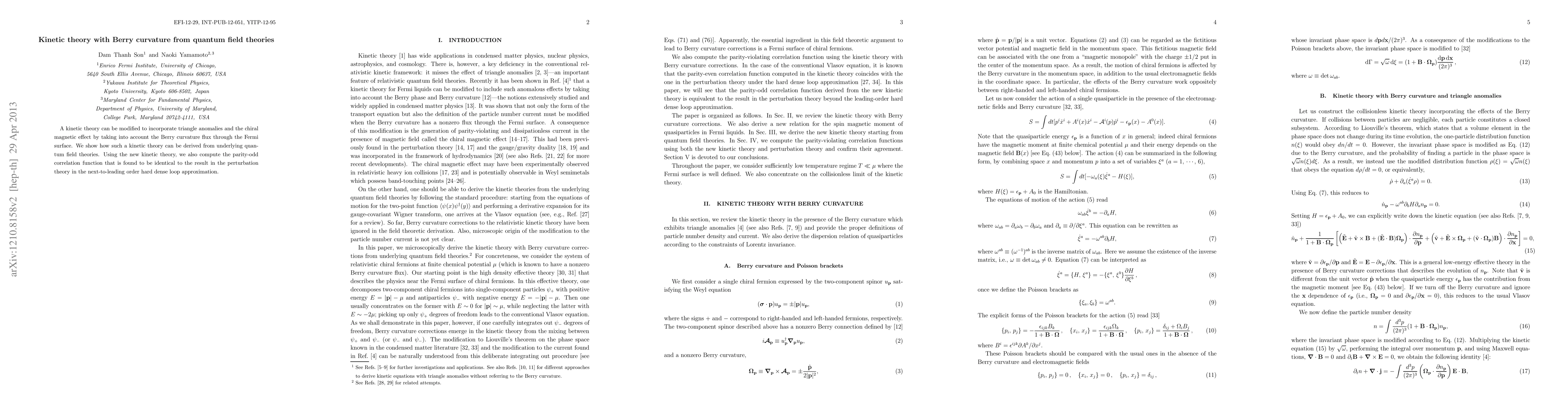 This paper develops a kinetic theory that incorporates quantum field theory's Berry curvature to account for triangle anomalies and the chiral magnetic effect, and demonstrates its derivation from underlying quantum field theories. The new kinetic theory accurately computes the parity-odd correlation function, matching the perturbation theory's next-to-leading order hard dense loop approximation.