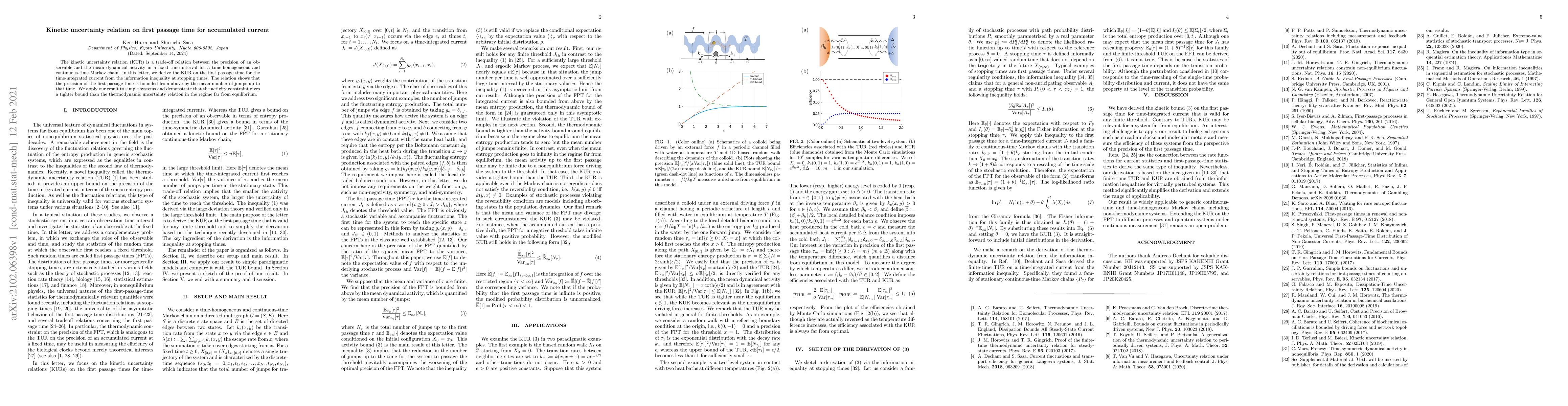 This paper derives a kinetic uncertainty relation (KUR) for the first passage time of time-integrated current in a continuous-time Markov chain, showing that its precision is bounded by the mean number of jumps. The derived KUR provides tighter bounds than the thermodynamic uncertainty relation in non-equilibrium regimes.