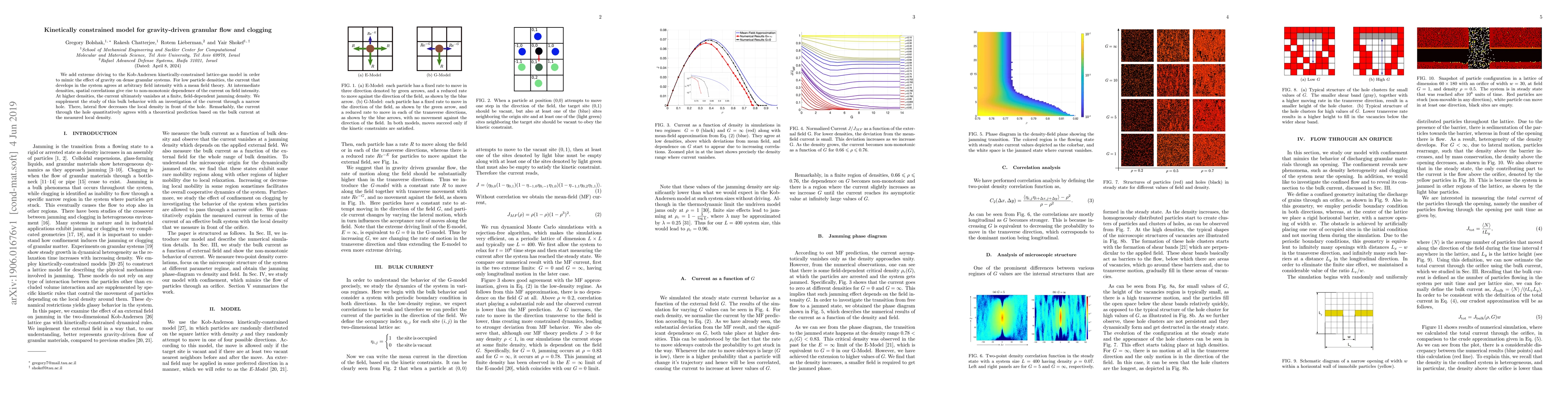 We add extreme driving to the Kob-Andersen kinetically-constrained lattice-gas model in order to mimic the effect of gravity on dense granular systems. For low particle densities, the current that develops in the system agrees at arbitrary field intensity with a mean field theory. At intermediate densities, spatial correlations give rise to non-monotonic dependence of the current on field intensity. At higher densities, the current ultimately vanishes at a finite, field-dependent jamming density. We supplement the study of this bulk behavior with an investigation of the current through a narrow hole. There, lateral flow decreases the local density in front of the hole. Remarkably, the current through the hole quantitatively agrees with a theoretical prediction based on the bulk current at the measured local density.