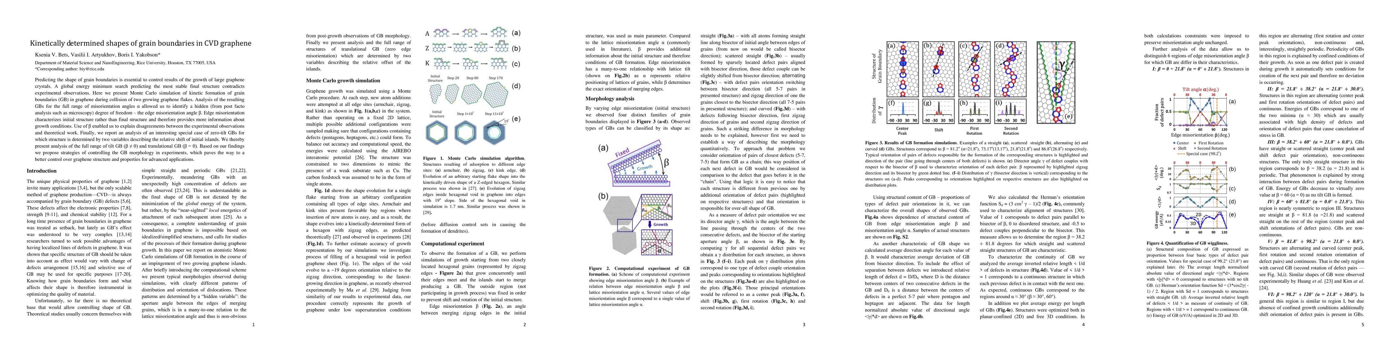 This paper uses Monte Carlo simulations to study the kinetic formation of grain boundaries in CVD graphene, identifying an edge misorientation angle that explains discrepancies between theoretical predictions and experimental observations. The authors propose strategies to control grain boundary morphology, enhancing the potential for advanced graphene applications.