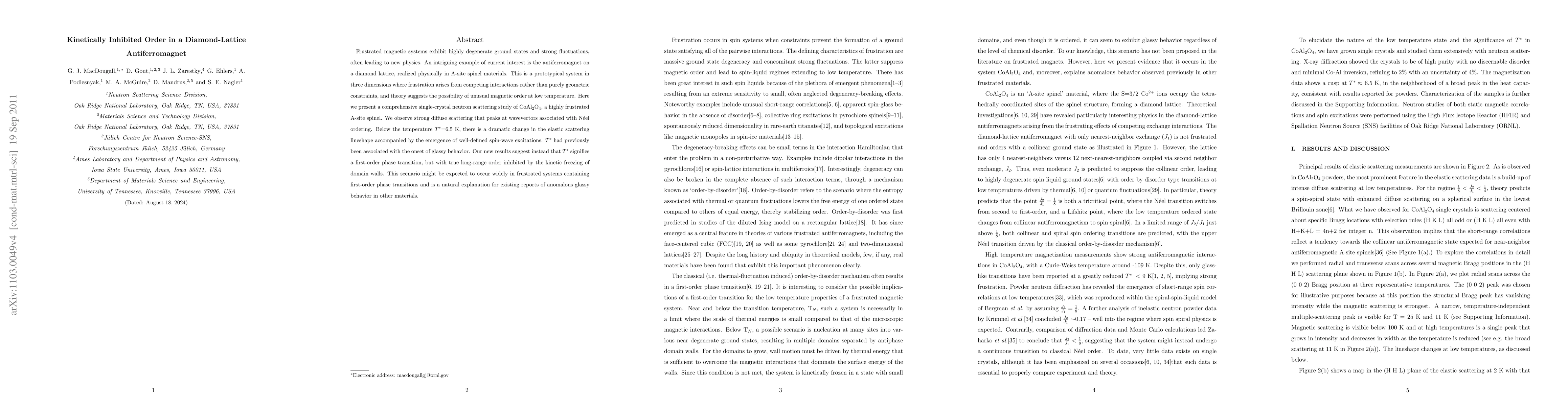 Frustrated magnetic systems exhibit highly degenerate ground states and strong fluctuations, often leading to new physics. An intriguing example of current interest is the antiferromagnet on a diamond lattice, realized physically in A-site spinel materials. This is a prototypical system in three dimensions where frustration arises from competing interactions rather than purely geometric constraints, and theory suggests the possibility of unusual magnetic order at low temperature. Here we present a comprehensive single-crystal neutron scattering study of CoAl2O4, a highly frustrated A-site spinel. We observe strong diffuse scattering that peaks at wavevectors associated with Neel ordering. Below the temperature T*=6.5 K, there is a dramatic change in the elastic scattering lineshape accompanied by the emergence of well-defined spin-wave excitations. T* had previously been associated with the onset of glassy behavior. Our new results suggest instead that T* signifies a first-order phase transition, but with true long-range order inhibited by the kinetic freezing of domain walls. This scenario might be expected to occur widely in frustrated systems containing first-order phase transitions and is a natural explanation for existing reports of anomalous glassy behavior in other materials.