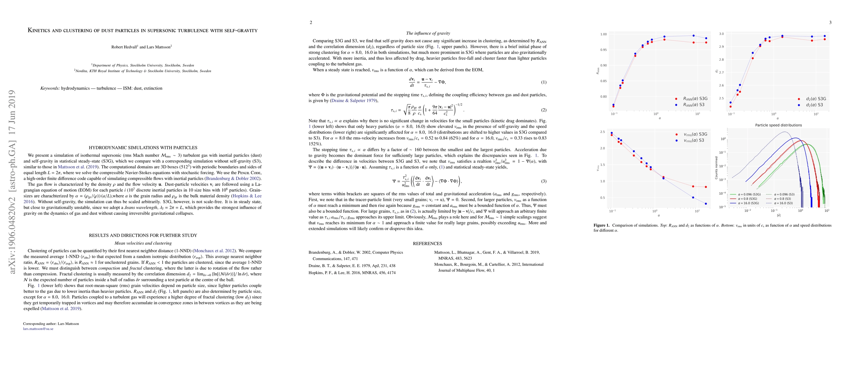 We present a simulation of isothermal supersonic (rms Mach number $\mathcal{M}_{\rm rms} \sim 3$) turbulent gas with inertial particles (dust) and self-gravity in statistical steady-state, which we compare with a corresponding simulation without self-gravity. The former is in steady state, but close to gravitationally unstable, since we match the scale of the simulation box with Jeans wavelength, which provides the strongest influence of gravity on the dynamics of gas and dust without causing irreversible gravitational collapses. We find that self-gravity does not cause any significant increase in clustering of particles, regardless of particle size, but heavy particles show elevated mean velocities in the presence of self-gravity. The speed distributions are significantly shifted to higher values compared to simulations without self-gravity, but maintains the same shape.