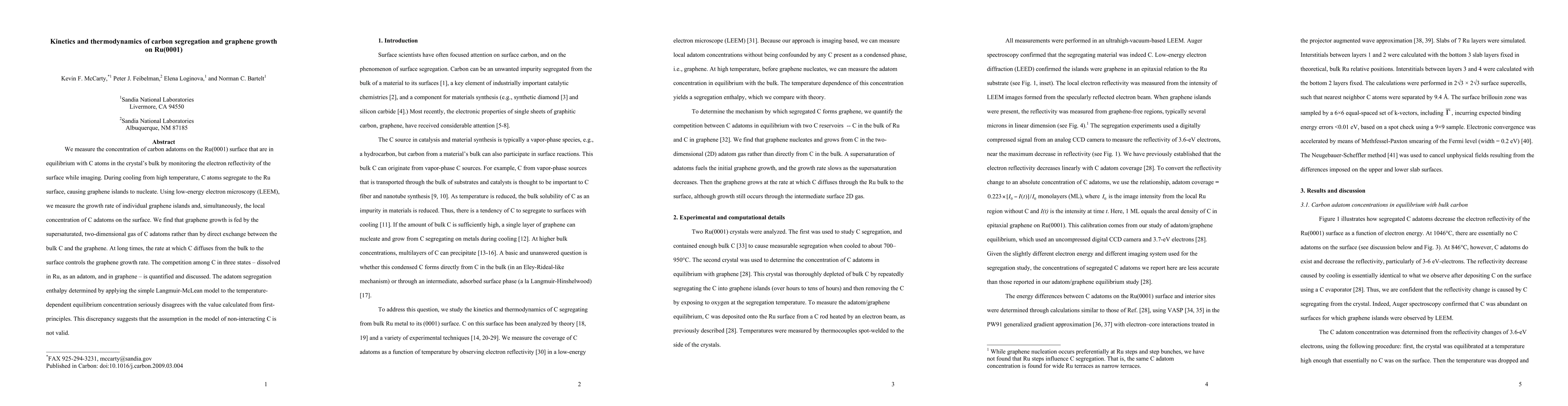This study investigates carbon segregation and graphene growth on Ru(0001) using electron reflectivity and low-energy electron microscopy, revealing that graphene growth is driven by a supersaturated gas of carbon adatoms rather than direct bulk-to-surface exchange, with diffusion controlling long-term growth. Discrepancies between measured and calculated adatom segregation enthalpy suggest limitations in the assumed non-interacting carbon model.