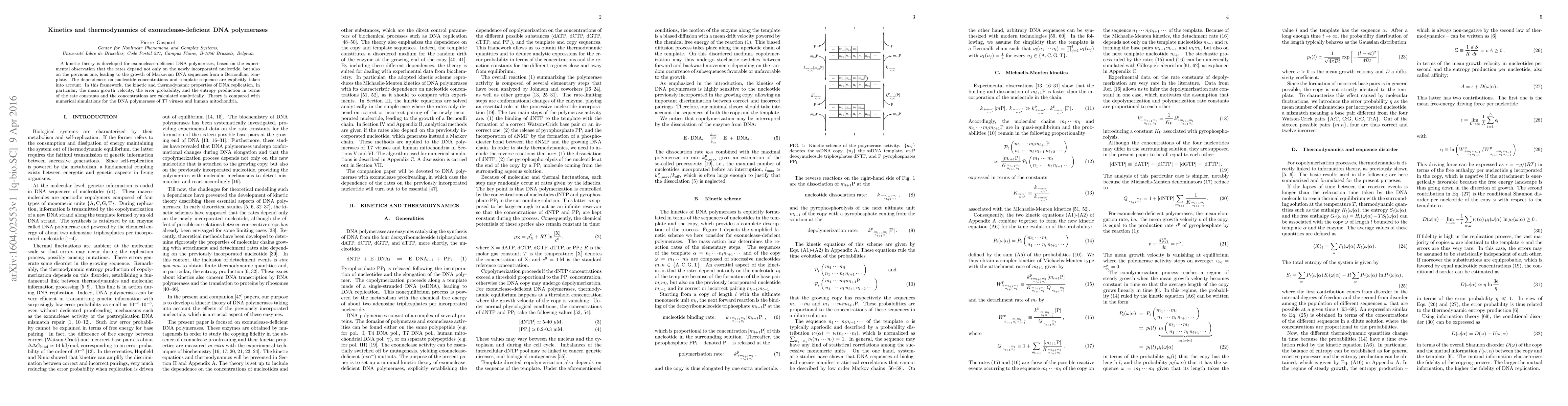 This paper develops a kinetic theory for exonuclease-deficient DNA polymerases, showing that nucleotide incorporation rates depend on both the current and previous nucleotides. The theory calculates mean growth velocity, error probability, and entropy production analytically, and compares these findings with simulations for T7 virus and human mitochondrial DNA polymerases.