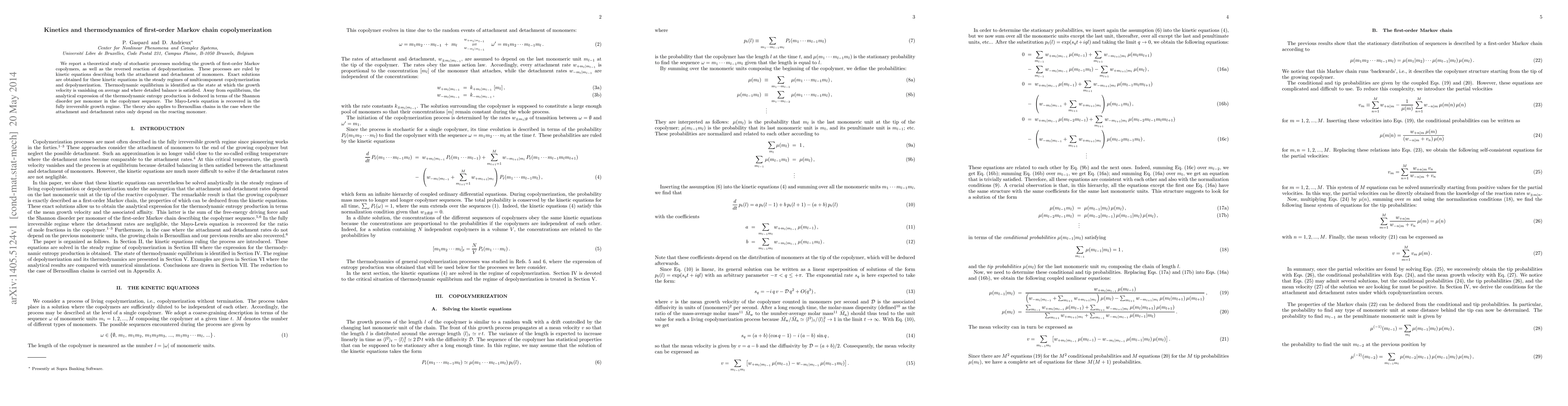 We report a theoretical study of stochastic processes modeling the growth of first-order Markov copolymers, as well as the reversed reaction of depolymerization. These processes are ruled by kinetic equations describing both the attachment and detachment of monomers. Exact solutions are obtained for these kinetic equations in the steady regimes of multicomponent copolymerization and depolymerization. Thermodynamic equilibrium is identified as the state at which the growth velocity is vanishing on average and where detailed balance is satisfied. Away from equilibrium, the analytical expression of the thermodynamic entropy production is deduced in terms of the Shannon disorder per monomer in the copolymer sequence. The Mayo-Lewis equation is recovered in the fully irreversible growth regime. The theory also applies to Bernoullian chains in the case where the attachment and detachment rates only depend on the reacting monomer.