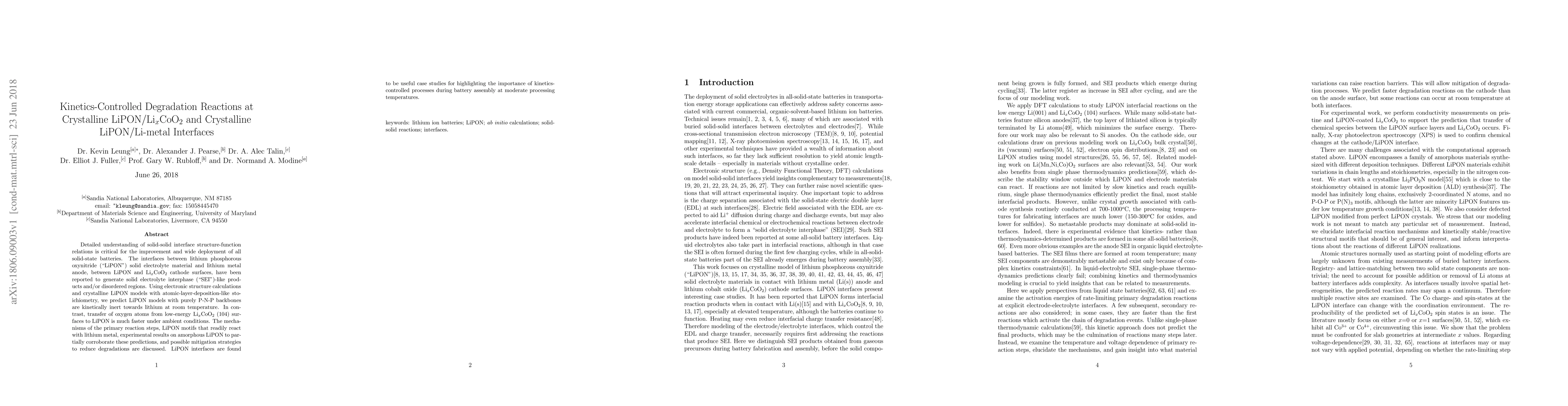 This paper investigates the kinetics-controlled degradation reactions at interfaces between LiPON solid electrolyte and lithium metal or Li(x)CoO(2) cathode, revealing that oxygen transfer from Li(x)CoO(2) to LiPON is faster than lithium reactions with LiPON. The study suggests strategies to mitigate degradations and highlights the importance of kinetics in battery assembly.