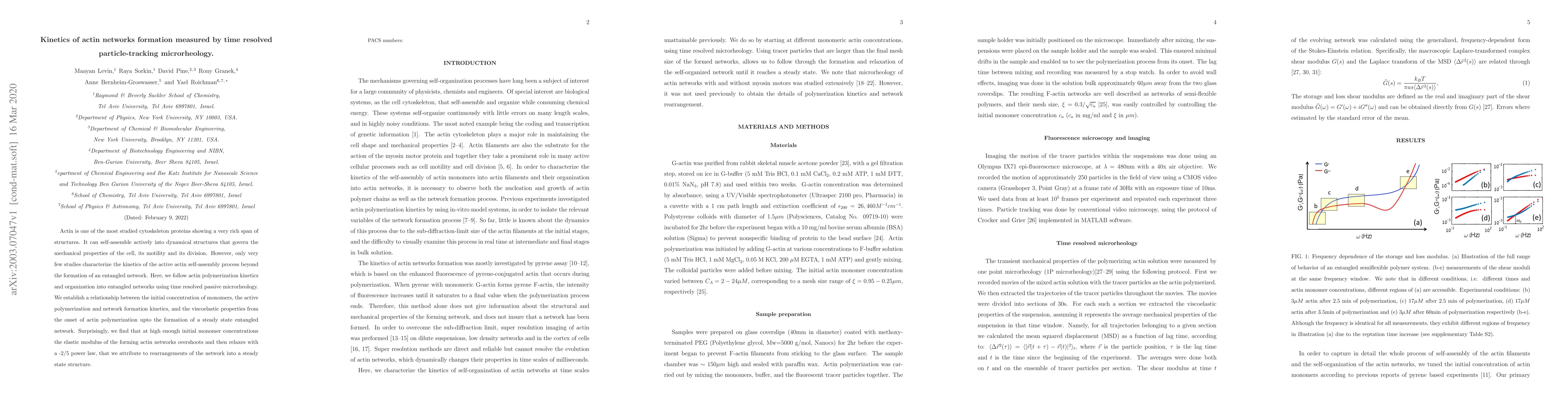 This study investigates the kinetics of actin network formation using time-resolved particle-tracking microrheology, revealing that high initial monomer concentrations lead to an elastic modulus overshoot followed by a relaxation with a -2/5 power law, attributed to network reorganization into a steady state structure.
