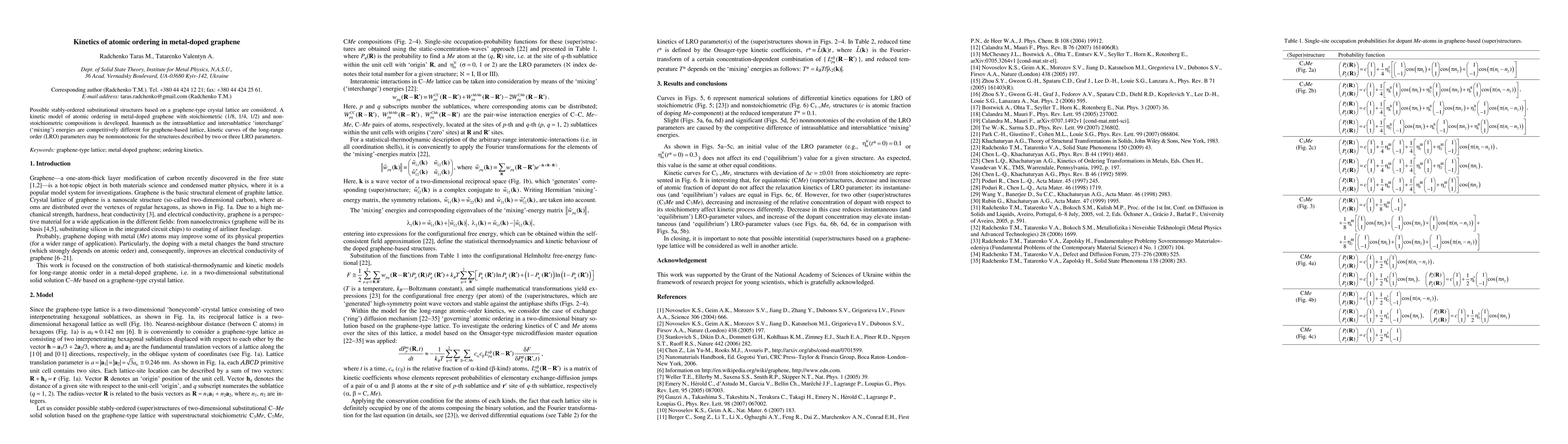 Possible stably-ordered substitutional structures based on a graphene-type crystal lattice are considered. A kinetic model of atomic ordering in metal-doped graphene with stoichiometric (1/8, 1/4, 1/2) and nonstoichiometric compositions is developed. Inasmuch as the intrasublattice and intersublattice 'interchange' ('mixing') energies are competitively different for graphene-based lattice, kinetic curves of the long-range order (LRO) parameters may be nonmonotonic for the structures described by two or three LRO parameters.