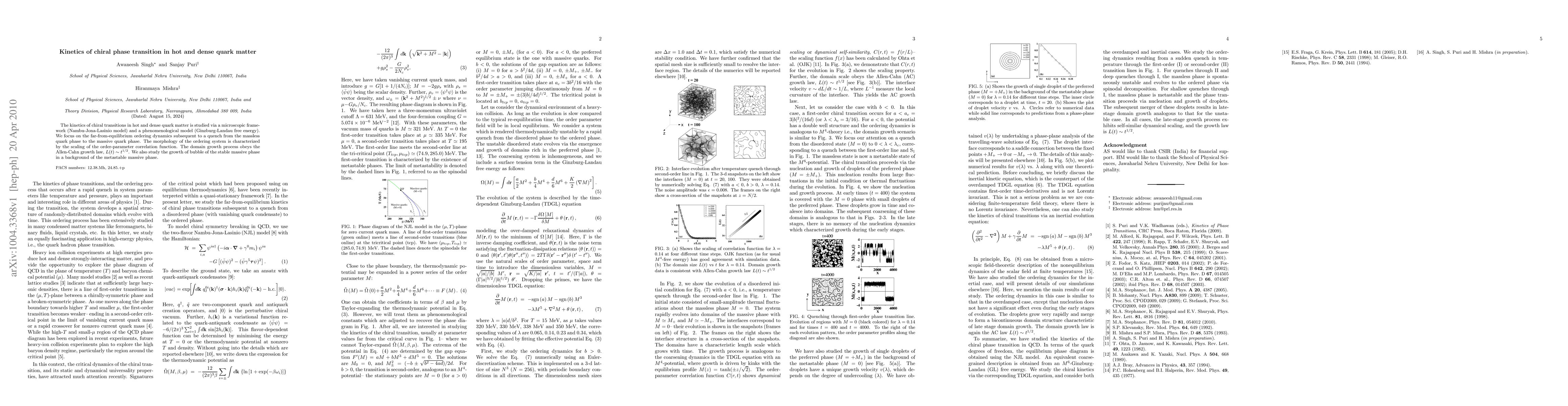 This paper investigates the dynamics of chiral phase transitions in hot and dense quark matter using the Nambu-Jona-Lasinio and Ginzburg-Landau models, focusing on the far-from-equilibrium ordering process after a quench. The study reveals that the order parameter correlation function scales according to the Allen-Cahn growth law, indicating domain growth proportional to $L(t)\sim t^{1/2}$.
