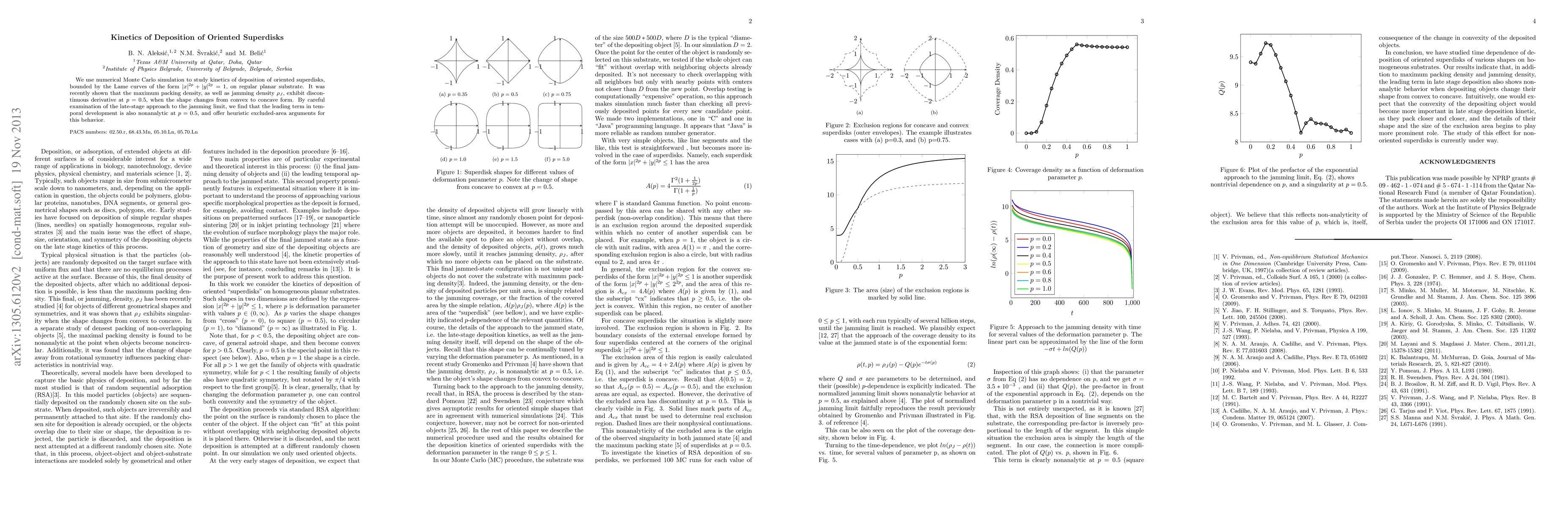 We use numerical Monte Carlo simulation to study kinetics of deposition of oriented superdisks, bounded by the Lame curves of the form $|x|^{2p}+|y|^{2p}=1$, on regular planar substrate. It was recently shown that the maximum packing density, as well as jamming density $\rho_{J}$, exhibit discontinuous derivative at $p=0.5$, when the shape changes from convex to concave form. By careful examination of the late-stage approach to the jamming limit, we find that the leading term in temporal development is also nonanalytic at $p=0.5$, and offer heuristic excluded-area arguments for this behavior.