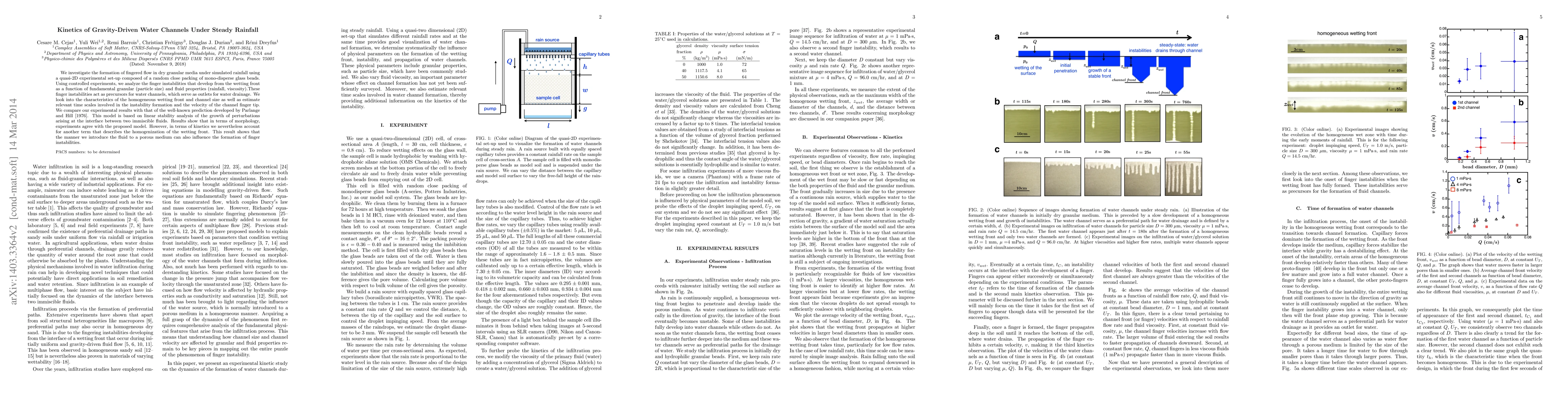 We investigate the formation of fingered flow in dry granular media under simulated rainfall using a quasi-2D experimental set-up composed of a random close packing of mono-disperse glass beads. Using controlled experiments, we analyze the finger instabilities that develop from the wetting front as a function of fundamental granular (particle size) and fluid properties (rainfall, viscosity).These finger instabilities act as precursors for water channels, which serve as outlets for water drainage. We look into the characteristics of the homogeneous wetting front and channel size as well as estimate relevant time scales involved in the instability formation and the velocity of the channel finger tip. We compare our experimental results with that of the well-known prediction developed by Parlange and Hill [1976]. This model is based on linear stability analysis of the growth of perturbations arising at the interface between two immiscible fluids. Results show that in terms of morphology, experiments agree with the proposed model. However, in terms of kinetics we nevertheless account for another term that describes the homogenization of the wetting front. This result shows that the manner we introduce the fluid to a porous medium can also influence the formation of finger instabilities.