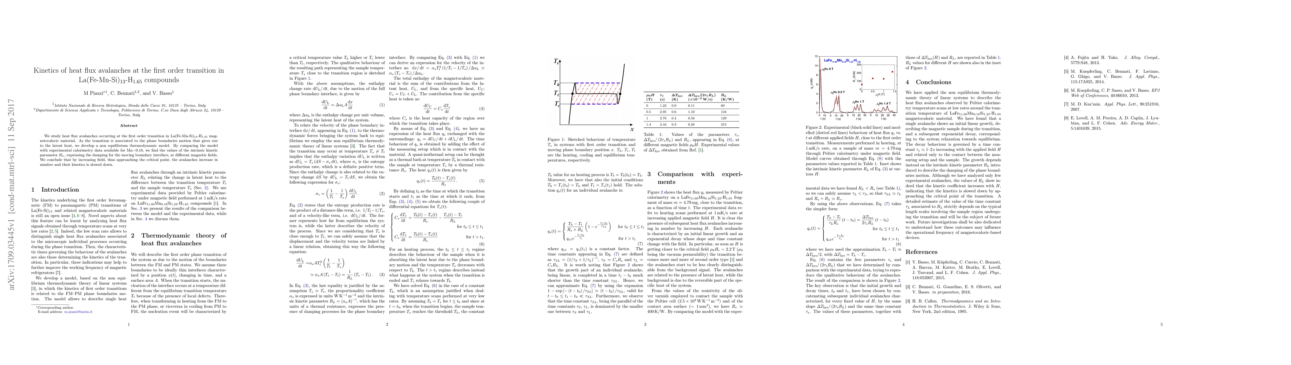 We study heat flux avalanches occurring at the first order transition in La(Fe-Mn-Si)$_{13}$-H$_{1.65}$ magnetocaloric material. As the transition is associated to the phase boundaries motion that gives rise to the latent heat, we develop a non equilibrium thermodynamic model. By comparing the model with experimental calorimetry data available for Mn=0.18, we find the values of the intrinsic kinetic parameter $R_L$, expressing the damping for the moving boundary interface, at different magnetic fields. We conclude that by increasing field, thus approaching the critical point, the avalanches increase in number and their kinetics is slowed down.