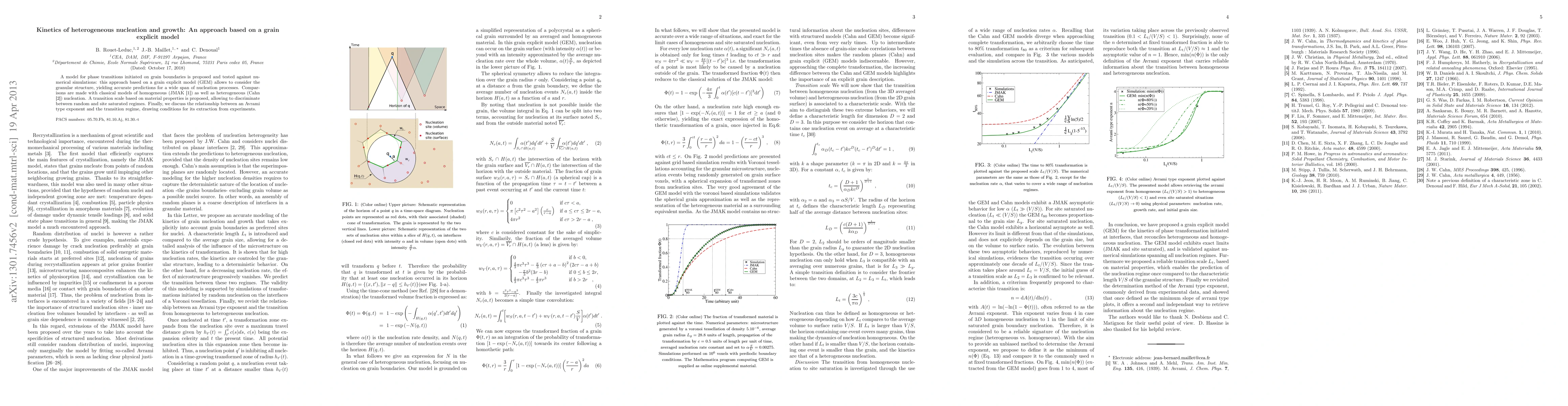 This paper proposes a grain explicit model (GEM) to study heterogeneous nucleation and growth on grain boundaries, comparing it to classical nucleation models. The model accurately predicts nucleation processes and introduces a transition scale to distinguish between random and site-saturated regimes, linking Avrami exponents to these regimes.