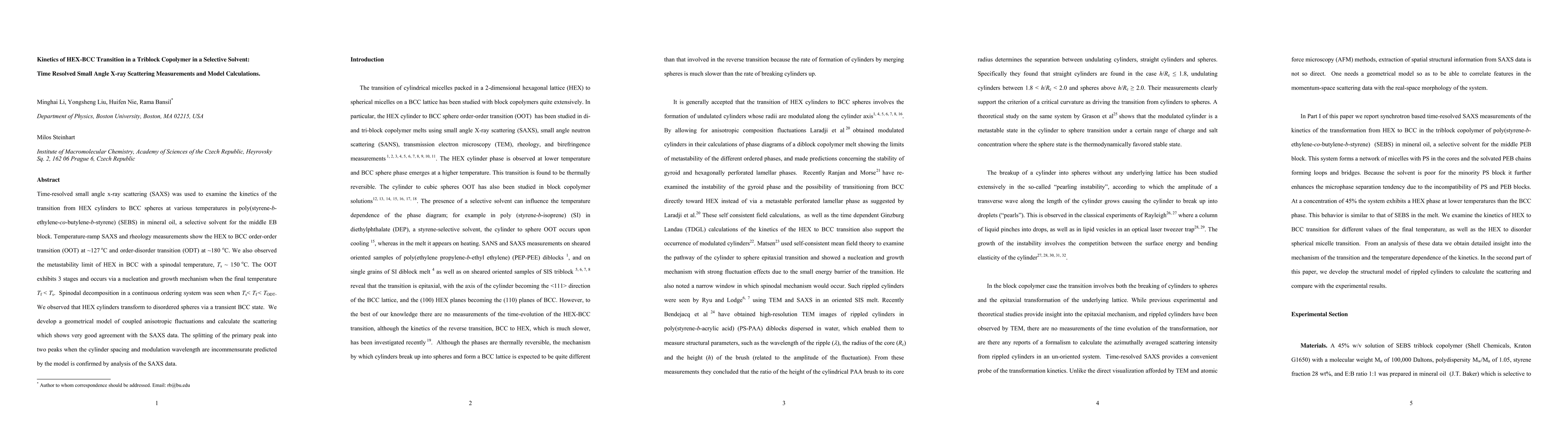 This study uses time-resolved small angle x-ray scattering to investigate the kinetics of the HEX-BCC phase transition in SEBS triblock copolymer in mineral oil. The transition occurs via nucleation and growth or spinodal decomposition, and involves a transient BCC state, with a model showing good agreement with experimental data.