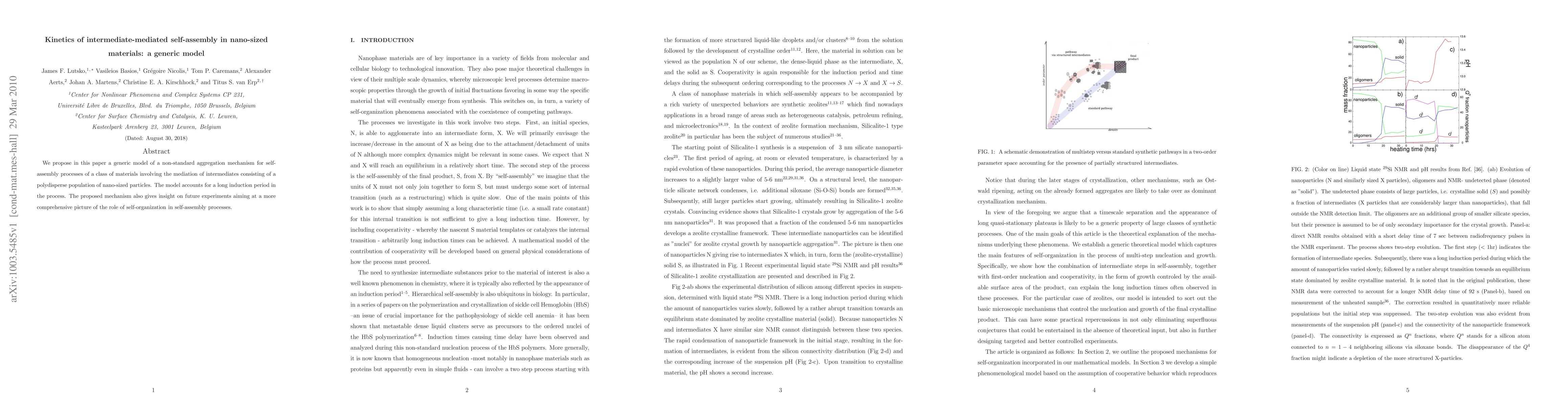We propose in this paper a generic model of a non-standard aggregation mechanism for self-assembly processes of a class of materials involving the mediation of intermediates consisting of a polydisperse population of nano-sized particles. The model accounts for a long induction period in the process. The proposed mechanism also gives insight on future experiments aiming at a more comprehensive picture of the role of self-organization in self-assembly processes.