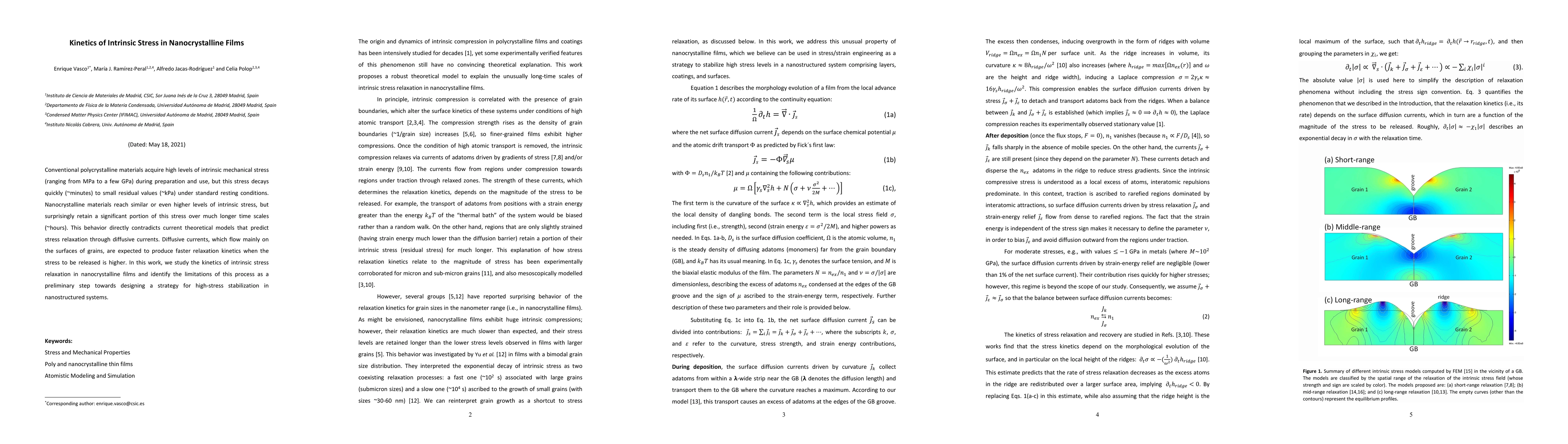 This paper investigates the kinetics of intrinsic stress relaxation in nanocrystalline films, revealing that they retain significant stress over hours despite high initial levels, contrary to predictions of rapid relaxation via diffusive currents. The study aims to identify the mechanisms limiting this relaxation to inform strategies for stabilizing high-stress in nanostructured materials.