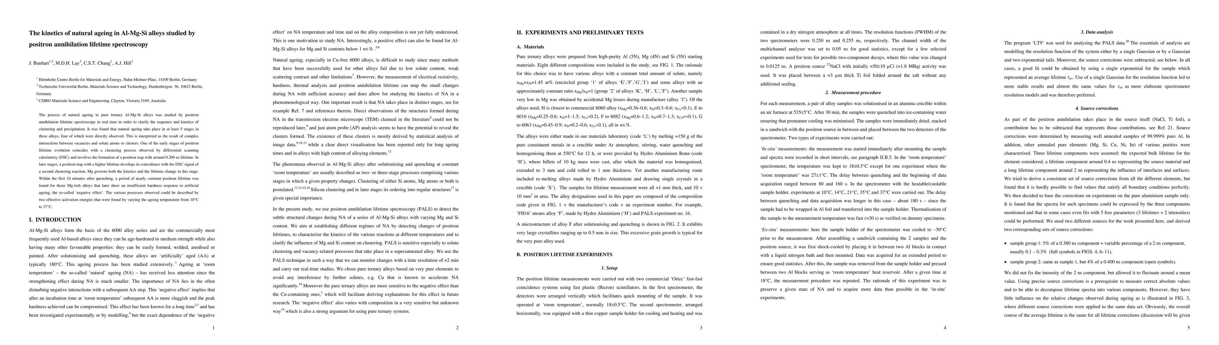 This study investigates the natural aging process in Al-Mg-Si alloys using positron annihilation lifetime spectroscopy, revealing five stages of clustering and precipitation, with Mg influencing kinetics and lifetime changes. The findings suggest a complex interplay between vacancies and solute atoms, with specific stages correlating to observed clustering processes.