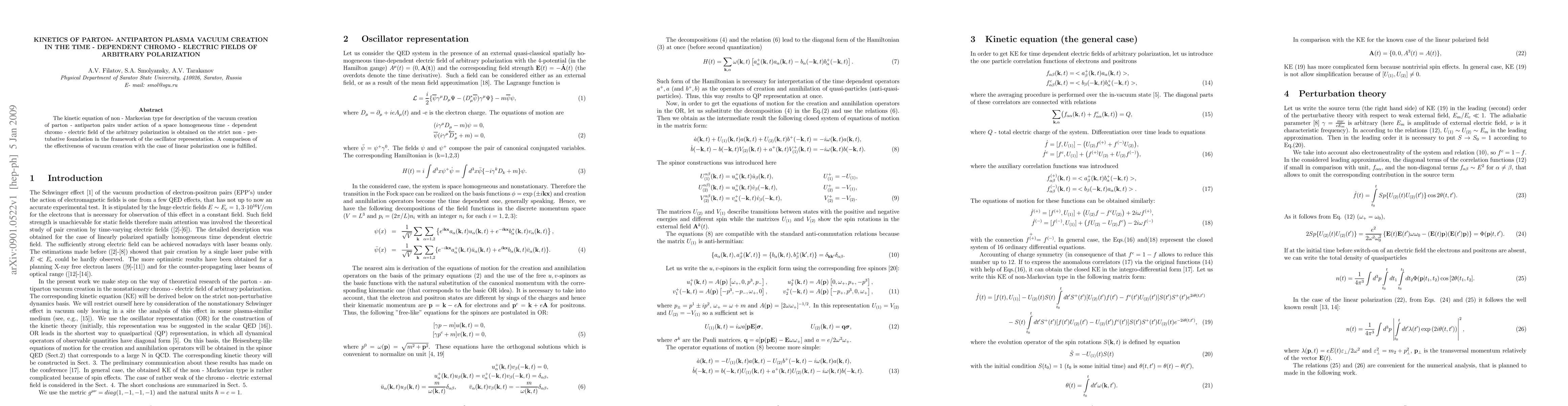 This paper derives a non-Markovian kinetic equation for parton-antiparton pair creation in time-dependent chromo-electric fields of arbitrary polarization, establishing a non-perturbative foundation using the oscillator representation. It also compares the efficiency of vacuum creation under arbitrary polarization to that under linear polarization.