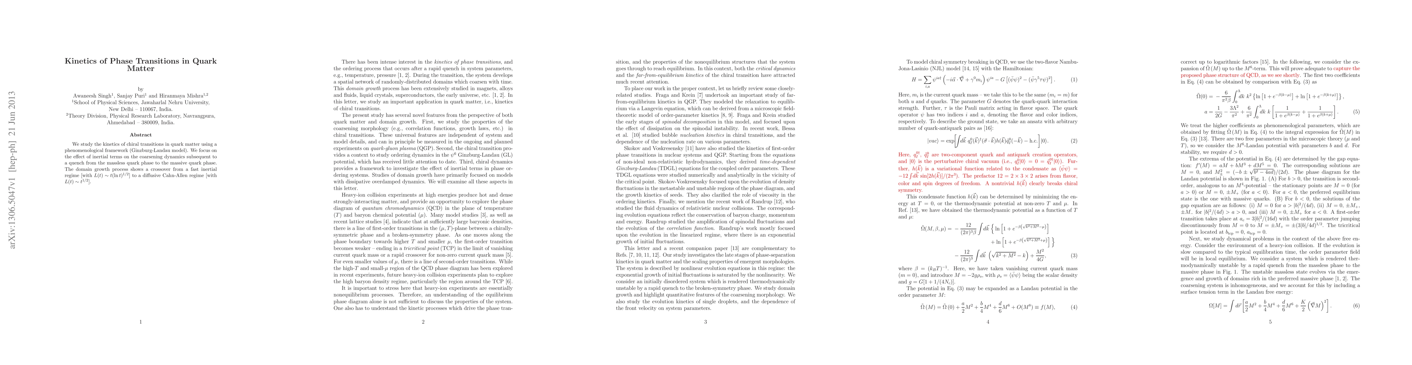 This research examines quark matter phase transitions, specifically the chiral transitions' kinetics using a Ginzburg-Landau model. It reveals a shift from fast inertial coarsening ($L(t) sim t (ln t)^{1/2}$) to diffusive Cahn-Allen regime ($L(t)sim t^{1/2}$) as domains grow post a quench from massless to massive quark phases.