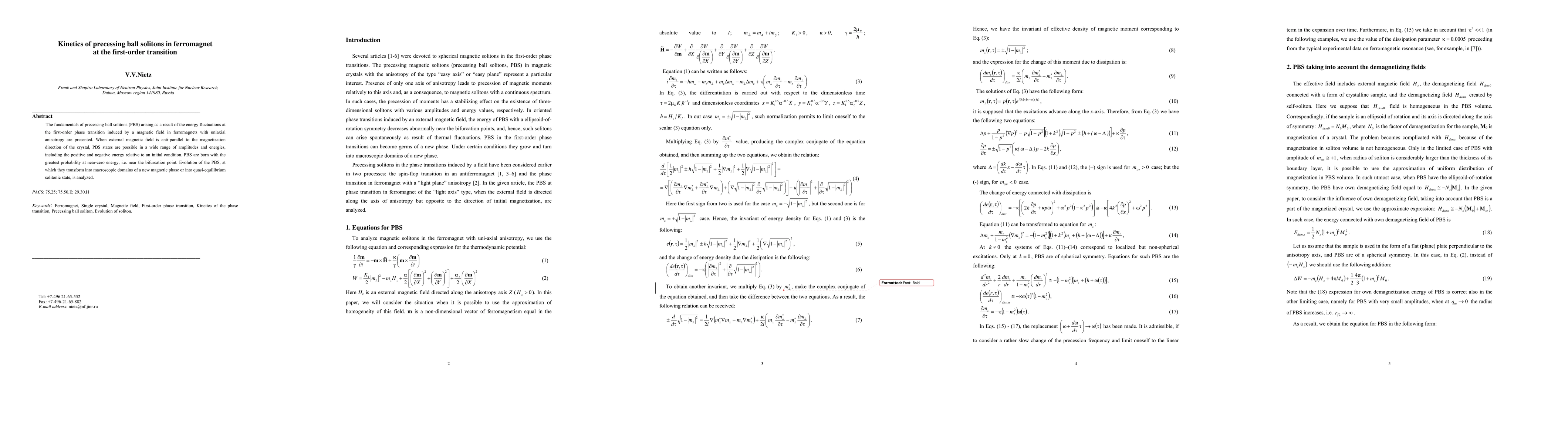 The fundamentals of precessing ball solitons (PBS) arising as a result of the energy fluctuations at the first-order phase transition induced by a magnetic field in ferromagnets with uniaxial anisotropy are presented. When external magnetic field is anti-parallel to the magnetization direction of the crystal, PBS states are possible in a wide range of amplitudes and energies, including the positive and negative energy relative to an initial condition. PBS are born with the greatest probability at near-zero energy, i.e. near the bifurcation point. Evolution of the PBS, at which they transform into macroscopic domains of a new magnetic phase or into quasi-equilibrium solitonic state, is analyzed.