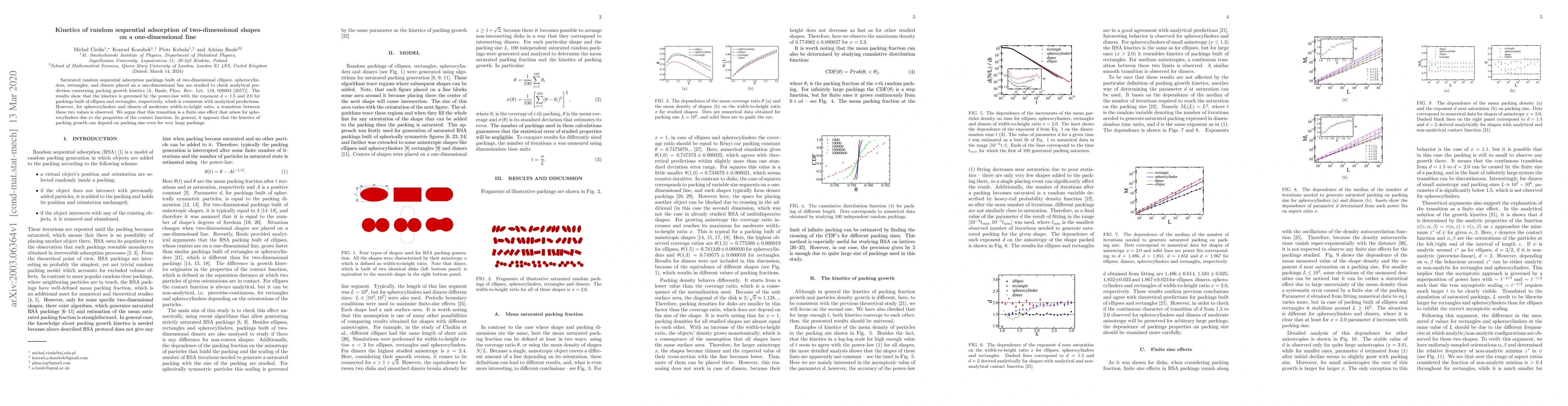 Researchers studied how 2D shapes pack on a 1D line and found that packing growth kinetics follows power-law rules with varying exponents for different shape types, highlighting the importance of shape properties and size in this process.