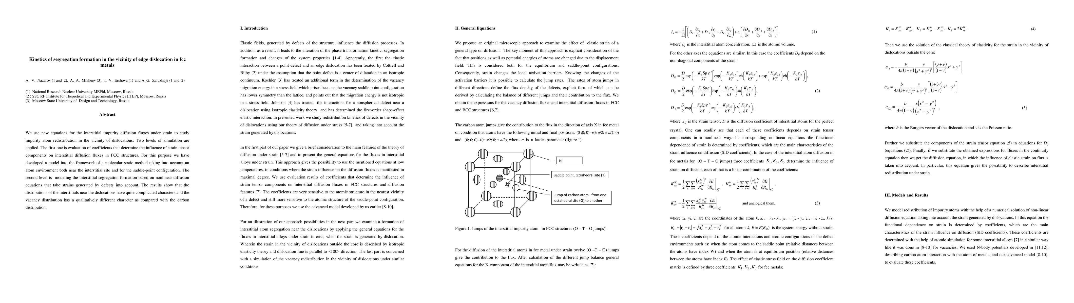 This research uses novel equations to study impurity atom redistribution around dislocations in fcc metals. It involves two simulation levels: determining strain tensor influence on diffusion fluxes via molecular static methods, and modeling interstitial segregation formation using nonlinear diffusion equations considering strain from defects. Results reveal complex interstitial distributions near dislocations and distinct vacancy distribution patterns.