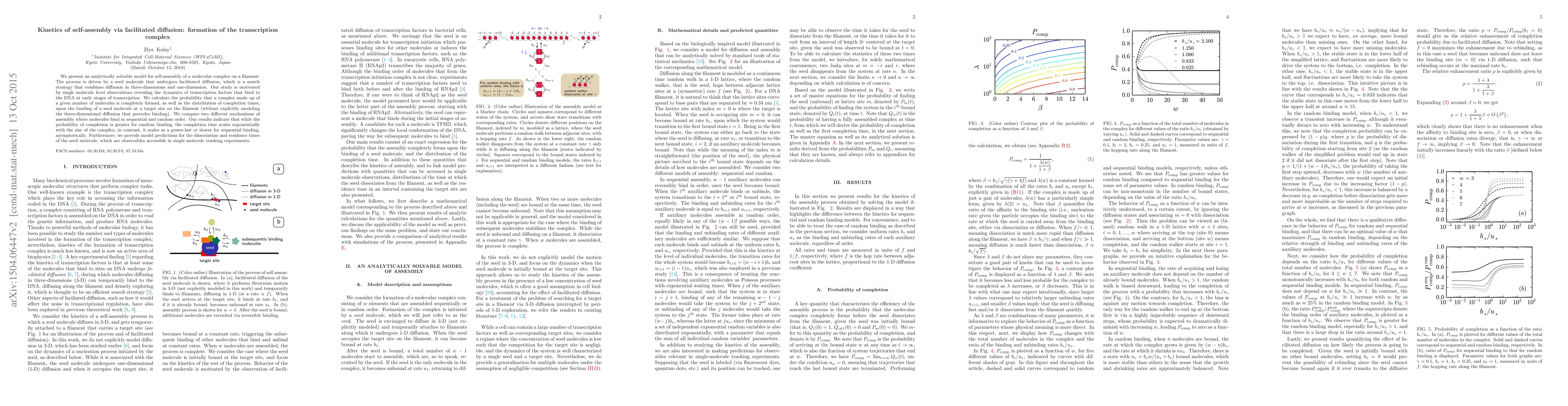 We present an analytically solvable model for self-assembly of a molecular complex on a filament. The process is driven by a seed molecule that undergoes facilitated diffusion, which is a search strategy that combines diffusion in three-dimensions and one-dimension. Our study is motivated by single molecule level observations revealing the dynamics of transcription factors that bind to the DNA at early stages of transcription. We calculate the probability that a complex made up of a given number of molecules is completely formed, as well as the distribution of completion times, upon the binding of a seed molecule at a target site on the filament (without explicitly modeling the three-dimensional diffusion that precedes binding). We compare two different mechanisms of assembly where molecules bind in sequential and random order. Our results indicate that while the probability of completion is greater for random binding, the completion time scales exponentially with the size of the complex; in contrast, it scales as a power-law or slower for sequential binding, asymptotically. Furthermore, we provide model predictions for the dissociation and residence times of the seed molecule, which are observables accessible in single molecule tracking experiments.