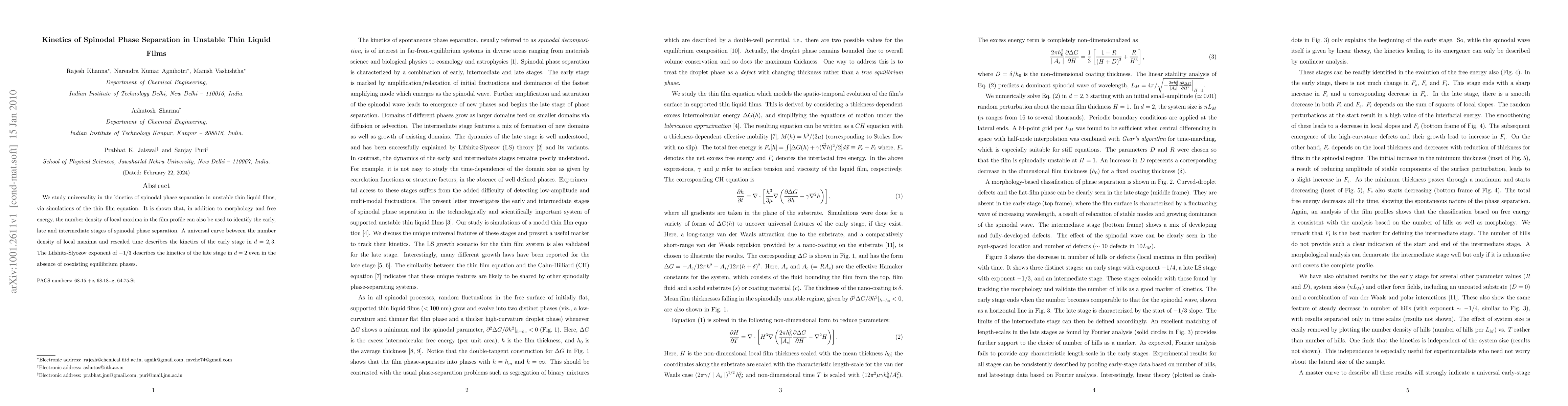 This paper investigates the kinetics of spinodal phase separation in unstable thin liquid films using simulations, revealing a universal relationship between the number density of local maxima in the film profile and rescaled time, which characterizes the early stages of separation. The study also finds that the Lifshitz-Slyozov exponent of -1/3 governs the late stage kinetics in two dimensions.