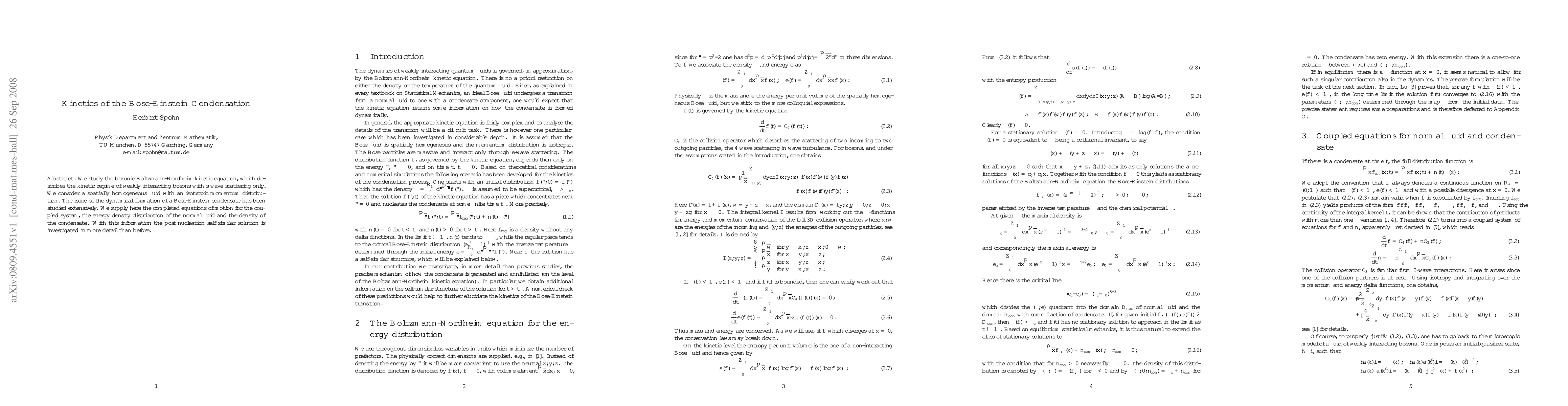 We study the bosonic Boltzmann-Nordheim kinetic equation, which describes the kinetic regime of weakly interacting bosons with s-wave scattering only. We consider a spatially homogeneous fluid with an isotropic momentum distribution. The issue of the dynamical formation of a Bose-Einstein condensate has been studied extensively. We supply here the completed equations of motion for the coupled system, the energy density distribution of the normal fluid and the density of the condensate. With this information the post-nucleation self-similar solution is investigated in more detail than before.