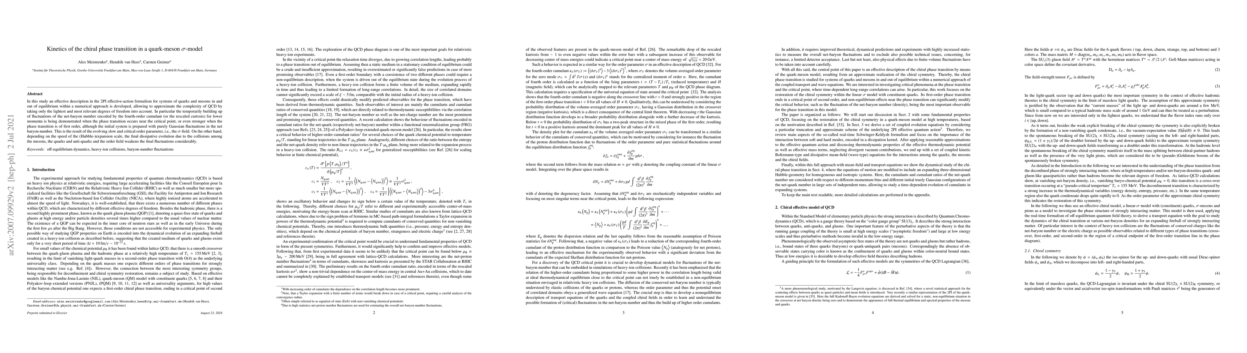 In this study an effective description in the 2PI effective-action formalism for systems of quarks and mesons in and out of equilibrium within a numerical approach is developed, allowing to approximate the complexity of QCD by taking only the lightest and most relevant degrees of freedom into account. In particular the temporarily building up of fluctuations of the net-baryon number encoded by the fourth-order cumulant (or the rescaled curtosis) for lower momenta is being demonstrated when the phase transition occurs near the critical point, or even stronger when the phase transition is of first order, although the initial system is prepared with purely Gaussian fluctuations in the net baryon number. This is the result of the evolving slow and critical order parameter, i.e., the $\sigma$-field. On the other hand, depending on the speed of the (Hubble-)expansion scale, the final dissipative evolution due to the collisions among the mesons, the quarks and anti-quarks and the order field weakens the final fluctuations considerably.