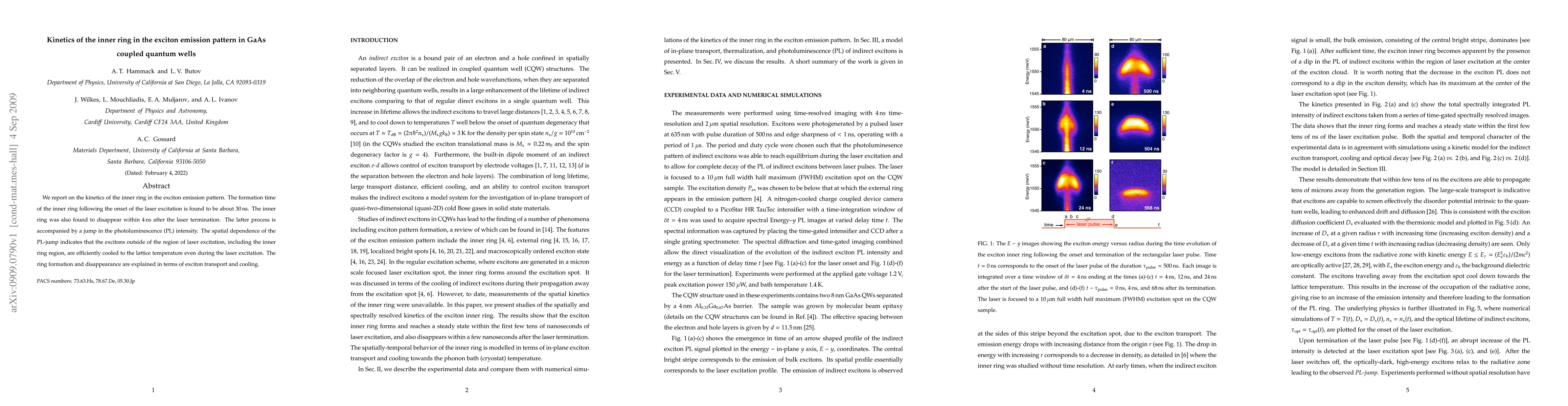 This study investigates the kinetics of the inner ring in exciton emission patterns in GaAs coupled quantum wells, finding that the inner ring forms within 30 ns post-laser excitation and disappears within 4 ns after excitation ceases, accompanied by a PL intensity jump, indicating efficient cooling of excitons outside the laser excitation region. The dynamics are explained through exciton transport and cooling mechanisms.