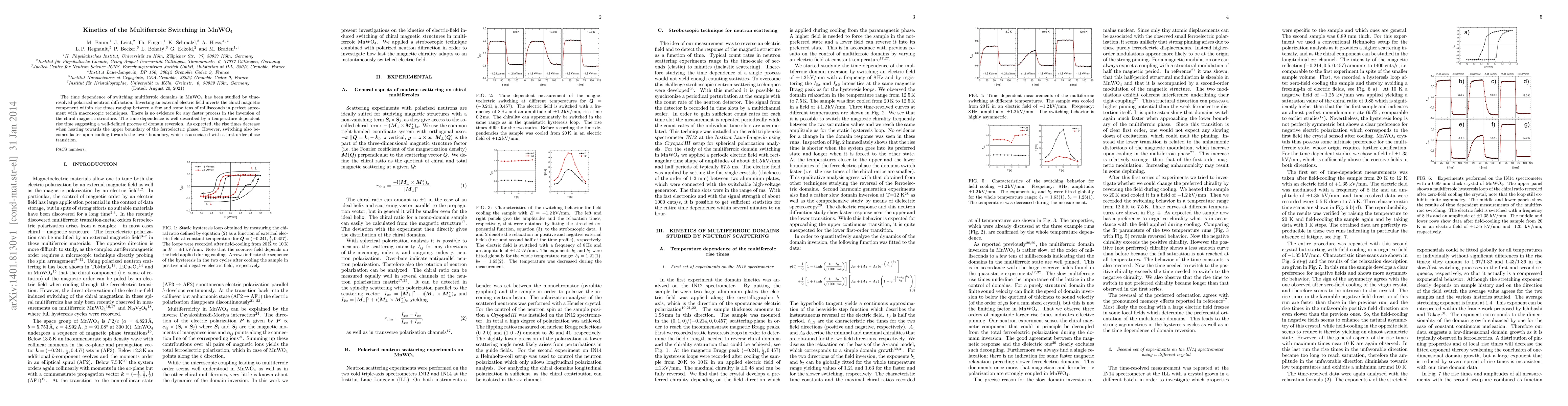 Researchers studied how switching happens in a material called MnWO$_4$, which can change between two magnetic states, finding that it takes milliseconds to switch and getting faster with temperature changes.