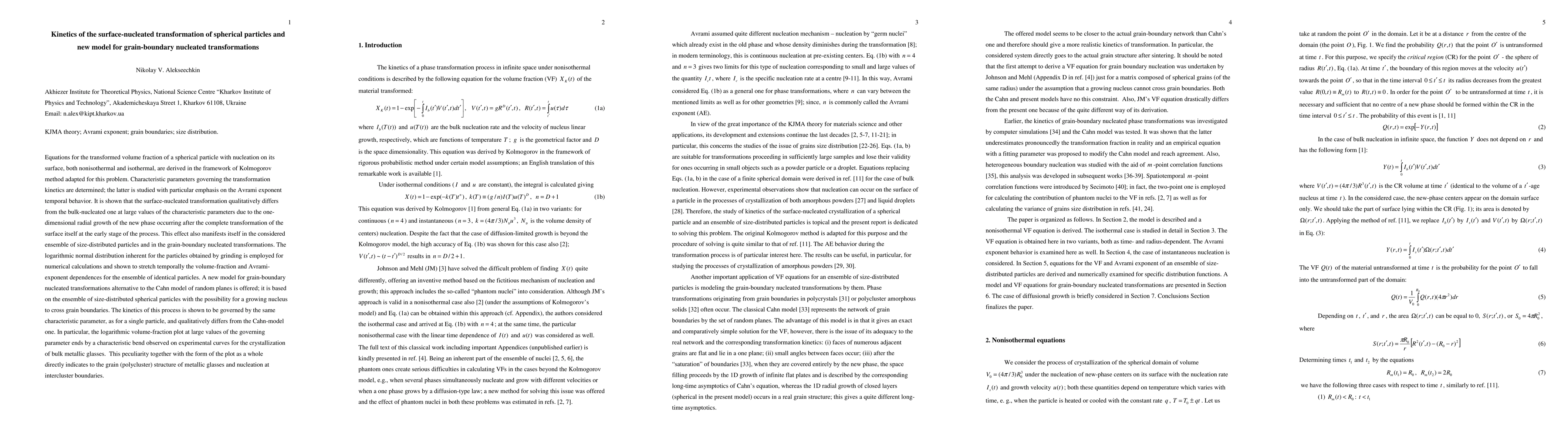 Equations for the transformed volume fraction of a spherical particle with nucleation on its surface, both nonisothermal and isothermal, are derived in the framework of Kolmogorov method adapted for this problem. Characteristic parameters governing the transformation kinetics are determined; the latter is studied with particular emphasis on the Avrami exponent temporal behavior. It is shown that the surface-nucleated transformation qualitatively differs from the bulk-nucleated one at large values of the characteristic parameters due to the one-dimensional radial growth of the new phase occurring after the complete transformation of the surface itself at the early stage of the process. This effect also manifests itself in the considered ensemble of size-distributed particles and in the grain-boundary nucleated transformations. The logarithmic normal distribution inherent for the particles obtained by grinding is employed for numerical calculations and shown to stretch temporally the volume-fraction and Avrami-exponent dependences for the ensemble of identical particles. A new model for grain-boundary nucleated transformations alternative to the Cahn model of random planes is offered; it is based on the ensemble of size-distributed spherical particles with the possibility for a growing nucleus to cross grain boundaries. The kinetics of this process is shown to be governed by the same characteristic parameter, as for a single particle, and qualitatively differs from the Cahn-model one. In particular, the logarithmic volume-fraction plot at large values of the governing parameter ends by a characteristic bend observed on experimental curves for the crystallization of bulk metallic glasses. This peculiarity together with the form of the plot as a whole directly indicates to the grain (polycluster) structure of metallic glasses and nucleation at intercluster boundaries.