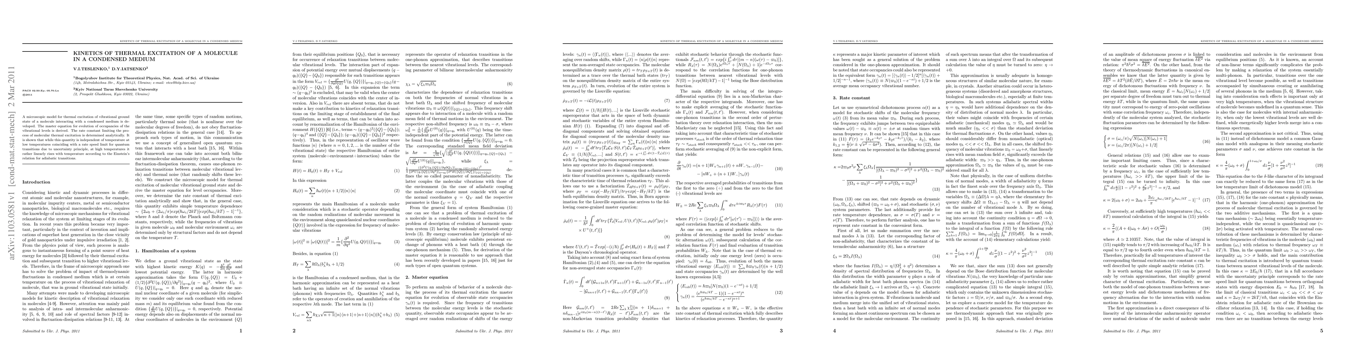 This paper develops a microscopic model to describe thermal excitation of a molecule's vibrational ground state in a condensed medium, deriving a master equation for vibrational level occupancies and analytically determining the rate constant for this process. The rate constant is temperature-independent at low temperatures but increases linearly with temperature at high temperatures, aligning with Einstein's relation for adiabatic transitions.