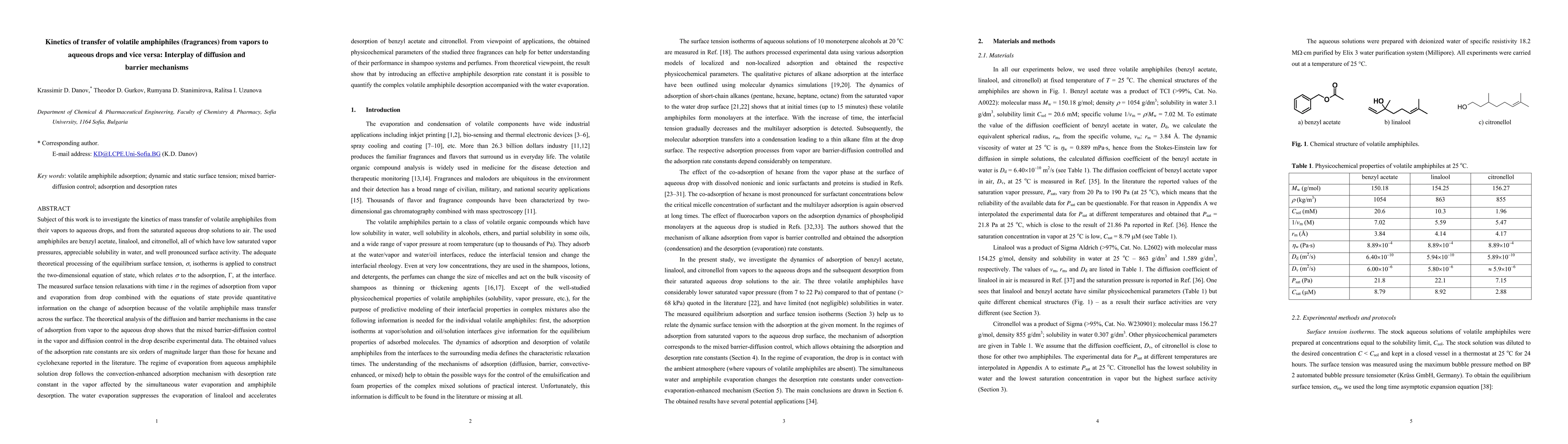 Subject of this work is to investigate the kinetics of mass transfer of volatile amphiphiles from their vapors to aqueous drops, and from the saturated aqueous drop solutions to air. The used amphiphiles are benzyl acetate, linalool, and citronellol. The adequate theoretical processing of the equilibrium surface tension isotherms is applied to construct the two-dimensional equation of state, which relates the surface tension to the adsorption at the interface. The measured surface tension relaxations with time in the regimes of adsorption from vapor and evaporation from drop combined with the equations of state provide quantitative information on the change of adsorption because of the volatile amphiphile mass transfer across the surface. The theoretical analysis of the diffusion and barrier mechanisms in the case of adsorption from vapor to the aqueous drop shows that the mixed barrier-diffusion control in the vapor and diffusion control in the drop describe experimental data. The obtained values of the adsorption rate constants are six orders of magnitude larger than those for hexane and cyclohexane reported in the literature. The regime of evaporation from aqueous amphiphile solution drop follows the convection-enhanced adsorption mechanism with desorption rate constant in the vapor affected by the simultaneous water evaporation and amphiphile desorption. The water evaporation suppresses the evaporation of linalool and accelerates desorption of benzyl acetate and citronellol. From viewpoint of applications, the obtained physicochemical parameters of the studied three fragrances can help for better understanding of their performance in shampoo systems and perfumes. From theoretical viewpoint, the result show that by introducing an effective amphiphile desorption rate constant it is possible to quantify the complex volatile amphiphile desorption accompanied with the water evaporation.