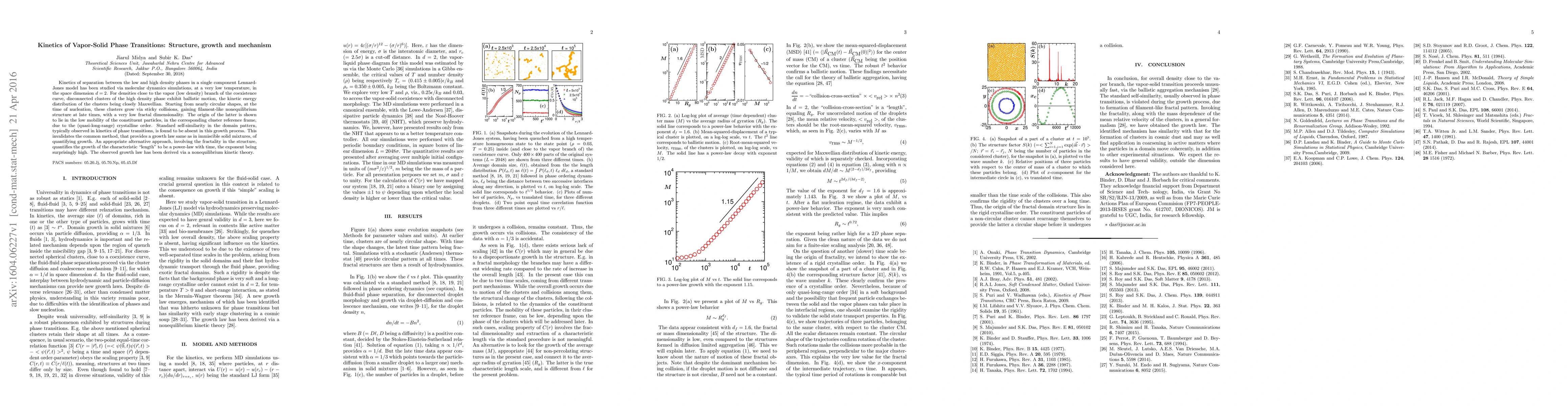 Kinetics of separation between the low and high density phases in a single component Lennard-Jones model has been studied via molecular dynamics simulations, at a very low temperature, in the space dimension $d=2$. For densities close to the vapor (low density) branch of the coexistence curve, disconnected clusters of the high density phase exhibit ballistic motion, the kinetic energy distribution of the clusters being closely Maxwellian. Starting from nearly circular shapes, at the time of nucleation, these clusters grow via sticky collisions, gaining filament-like nonequilibrium structure at late times, with a very low fractal dimensionality. The origin of the latter is shown to lie in the low mobility of the constituent particles, in the corresponding cluster reference frame, due to the (quasi-long-range) crystalline order. Standard self-similarity in the domain pattern, typically observed in kinetics of phase transitions, is found to be absent in this growth process. This invalidates the common method, that provides a growth law same as in immiscible solid mixtures, of quantifying growth. An appropriate alternative approach, involving the fractality in the structure, quantifies the growth of the characteristic "length" to be a power-law with time, the exponent being surprisingly high. The observed growth law has been derived via a nonequilibrium kinetic theory.
