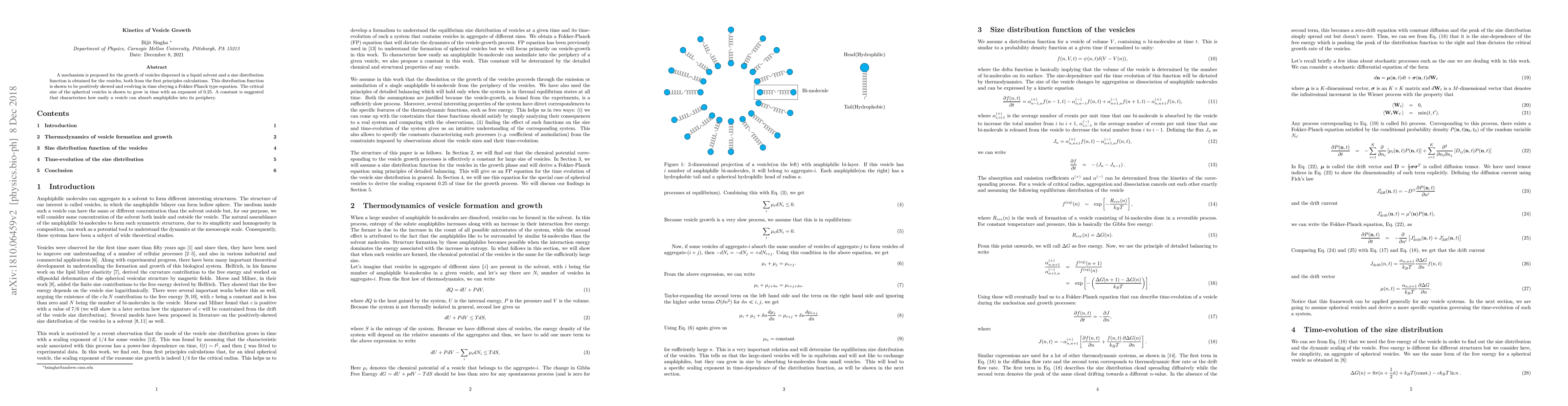 A mechanism is proposed for the growth of vesicles dispersed in a liquid solvent and a size distribution function is obtained for the vesicles, both from the first principles calculations. This distribution function is shown to be positively skewed and evolving in time obeying a Fokker-Planck type equation. The critical size of the spherical vesicles is shown to grow in time with an exponent of 0.25. A constant is suggested that characterizes how easily a vesicle can absorb amphiphiles into its periphery.