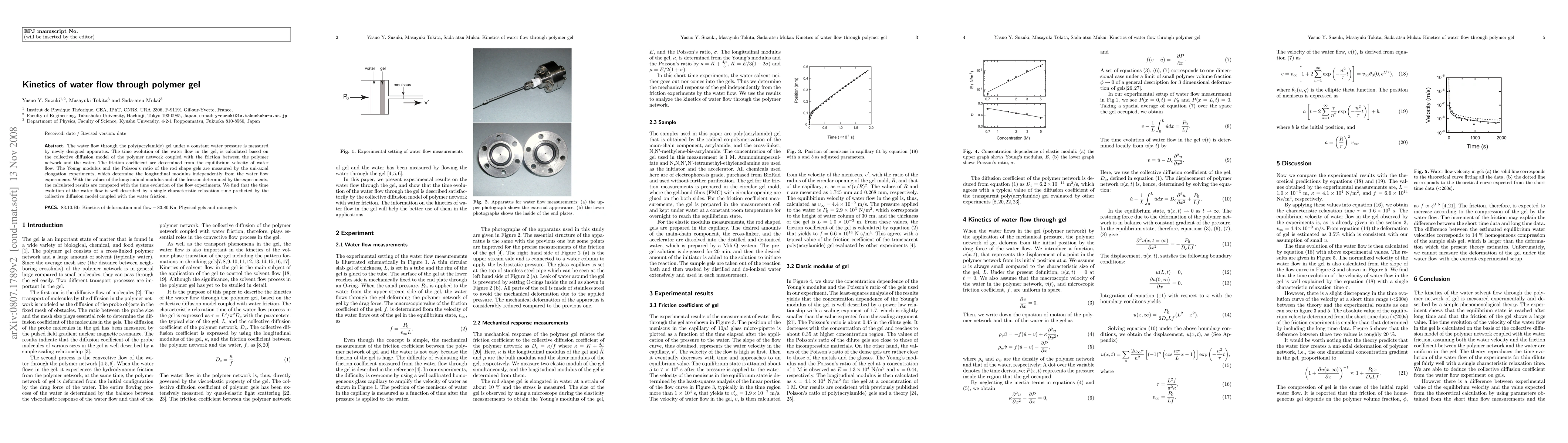 The water flow through the poly(acrylamide) gel under a constant water pressure is measured by newly designed apparatus. The time evolution of the water flow in the gel, is calculated based on the collective diffusion model of the polymer network coupled with the friction between the polymer network and the water. The friction coefficient are determined from the equilibrium velocity of water flow. The Young modulus and the Poisson's ratio of the rod shape gels are measured by the uni-axial elongation experiments, which determine the longitudinal modulus independently from the water flow experiments. With the values of the longitudinal modulus and of the friction determined by the experiments, the calculated results are compared with the time evolution of the flow experiments. We find that the time evolution of the water flow is well described by a single characteristic relaxation time predicted by the collective diffusion model coupled with the water friction.