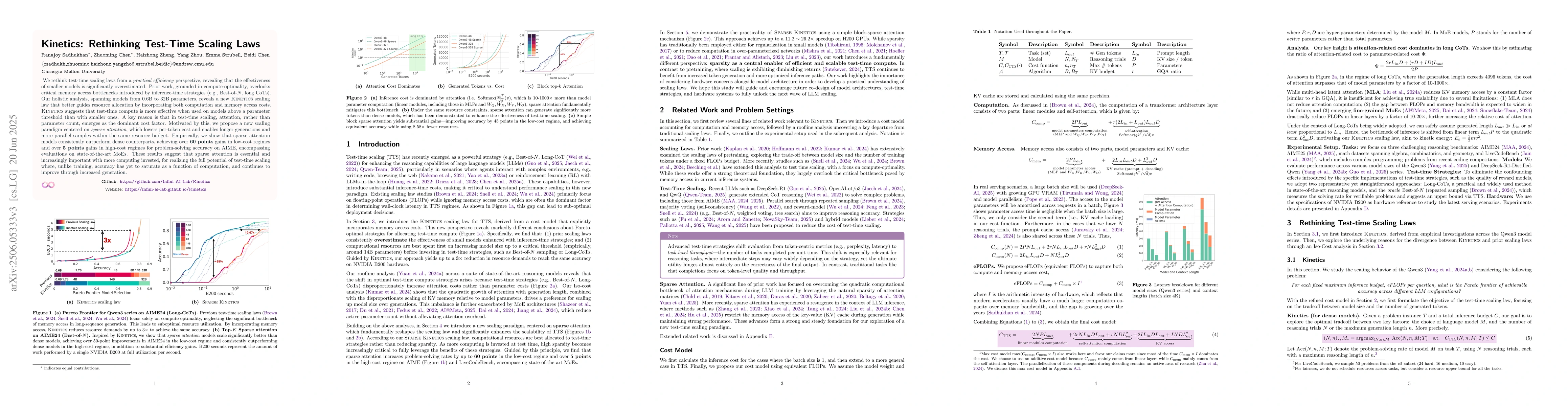 We rethink test-time scaling laws from a practical efficiency perspective, revealing that the effectiveness of smaller models is significantly overestimated. Prior work, grounded in compute-optimality, overlooks critical memory access bottlenecks introduced by inference-time strategies (e.g., Best-of-$N$, long CoTs). Our holistic analysis, spanning models from 0.6B to 32B parameters, reveals a new Kinetics Scaling Law that better guides resource allocation by incorporating both computation and memory access costs. Kinetics Scaling Law suggests that test-time compute is more effective when used on models above a threshold than smaller ones. A key reason is that in TTS, attention, rather than parameter count, emerges as the dominant cost factor. Motivated by this, we propose a new scaling paradigm centered on sparse attention, which lowers per-token cost and enables longer generations and more parallel samples within the same resource budget. Empirically, we show that sparse attention models consistently outperform dense counterparts, achieving over 60 points gains in low-cost regimes and over 5 points gains in high-cost regimes for problem-solving accuracy on AIME, encompassing evaluations on state-of-the-art MoEs. These results suggest that sparse attention is essential and increasingly important with more computing invested, for realizing the full potential of test-time scaling where, unlike training, accuracy has yet to saturate as a function of computation, and continues to improve through increased generation. The code is available at https://github.com/Infini-AI-Lab/Kinetics.