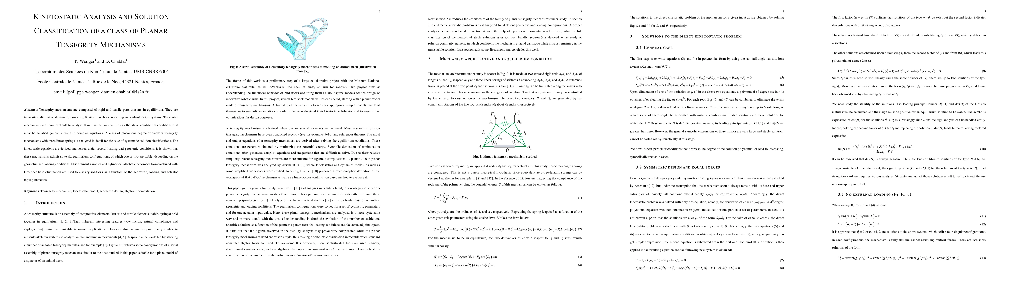 This paper analyzes a class of planar tensegrity mechanisms with three linear springs, deriving and solving kinetostatic equations to classify their equilibrium configurations under various conditions. The study reveals up to six possible configurations, with one or two being stable, and employs advanced mathematical techniques for systematic solution classification.