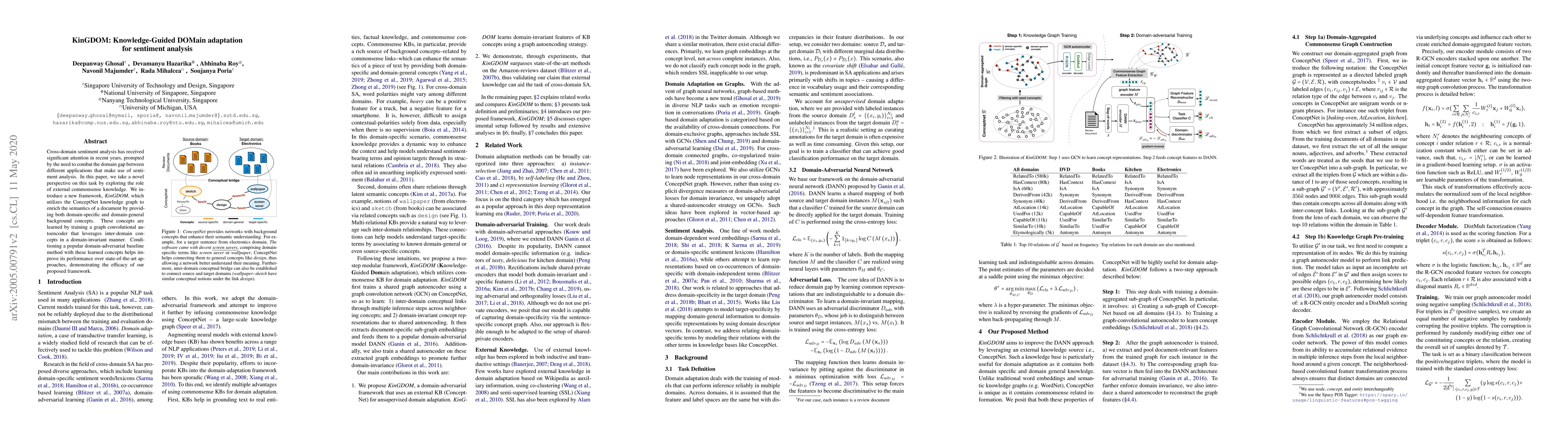 This paper introduces KinGDOM, a framework for cross-domain sentiment analysis that leverages ConceptNet knowledge to enrich document semantics. It employs a graph convolutional autoencoder to learn domain-invariant concepts, which enhance a domain-adversarial baseline, outperforming state-of-the-art methods.