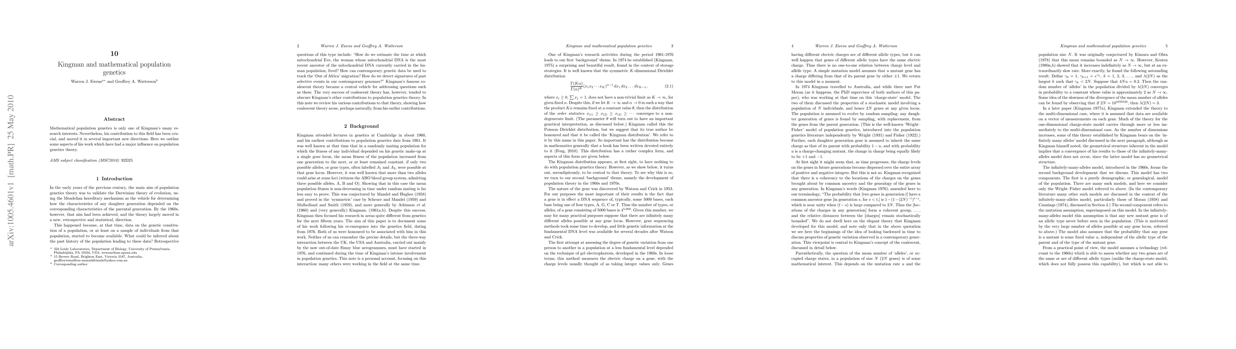 Summary: This paper highlights Kingman's pivotal contributions to mathematical population genetics, emphasizing his role in advancing the field and shaping its theoretical framework. His work has significantly influenced the direction and development of population genetics theory.
