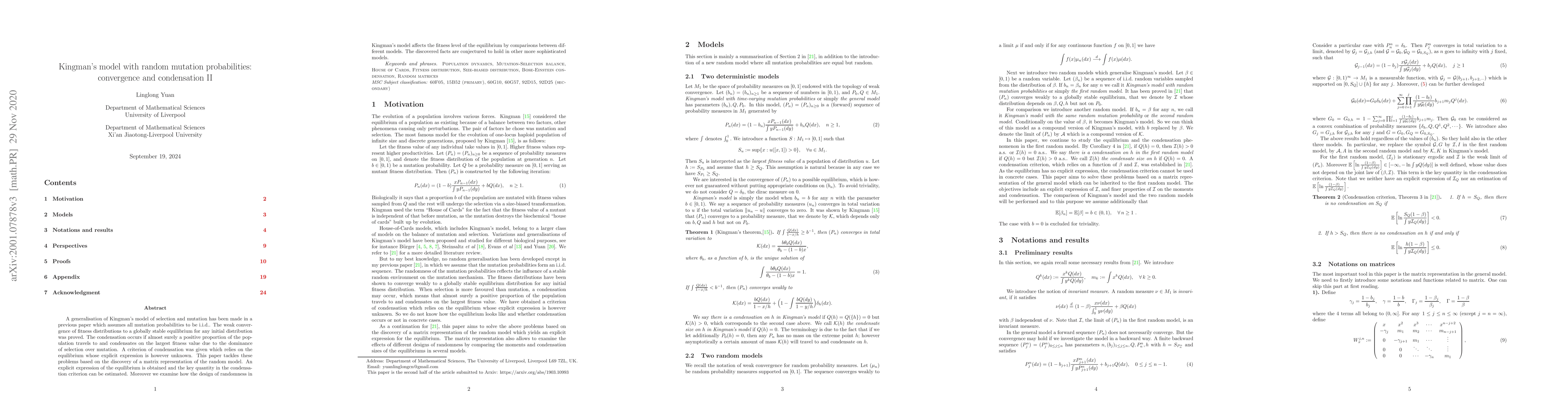 Kingman's model describes the evolution of a one-locus haploid population of infinite size and discrete generations under the competition of selection and mutation. A random generalisation has been made in a previous paper which assumes all mutation probabilities to be i.i.d.. The weak convergence of fitness distributions to a globally stable equilibrium for any initial distribution was proved. A condensation occurs if almost surely a positive proportion of the population travels to and condensates on the largest fitness value due to the dominance of selection over mutation. A criterion of condensation was given which relies on the equilibrium whose explicit expression is however unknown. This paper tackles these problems based on the discovery of a matrix representation of the random model. An explicit expression of the equilibrium is obtained and the key quantity in the condensation criterion can be estimated. Moreover we examine how the design of randomness in Kingman's model affects the fitness level of the equilibrium by comparisons between different models. The discovered facts are conjectured to hold in other more sophisticated models.