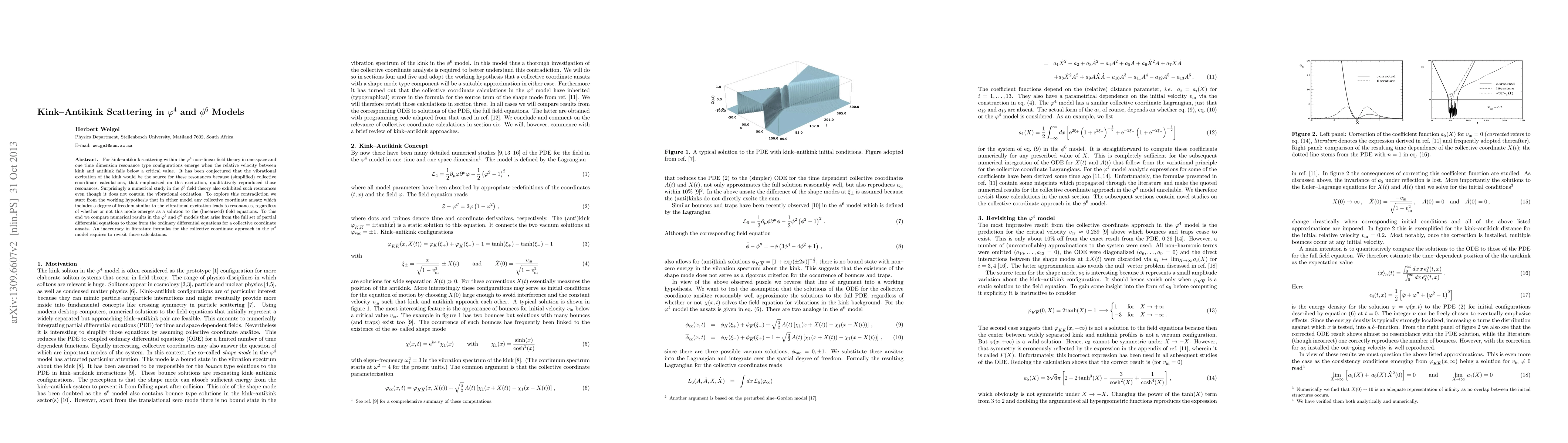 For kink-antikink scattering within the \phi^4 non--linear field theory in one space and one time dimension resonance type configurations emerge when the relative velocity between kink and antikink falls below a critical value. It has been conjectured that the vibrational excitation of the kink would be the source for these resonances because (simplified) collective coordinate calculations, that emphasized on this excitation, qualitatively reproduced those resonances. Surprisingly a numerical study in the \phi^6 field theory also exhibited such resonances even though it does not contain the vibrational excitation. To explore this contradiction we start from the working hypothesis that in either model any collective coordinate ansatz which includes a degree of freedom similar to the vibrational excitation leads to resonances, regardless of whether or not this mode emerges as a solution to the (linearized) field equations. To this end we compare numerical results in the \phi^4 and \phi^6 models that arise from the full set of partial differential equations to those from the ordinary differential equations for a collective coordinate ansatz. An inaccuracy in literature formulas for the collective coordinate approach in the \phi^4 model requires to revisit those calculations.