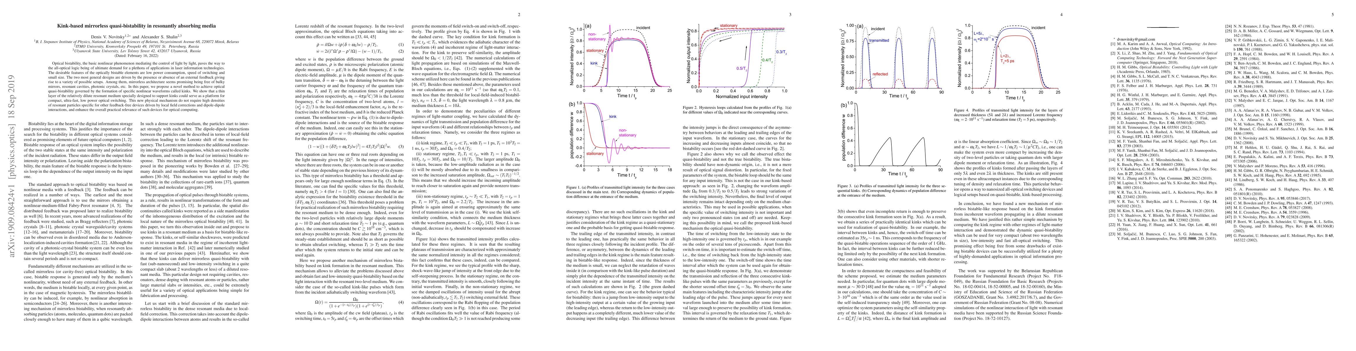 Optical bistability, the basic nonlinear phenomenon mediating the control of light by light, paves the way to the all-optical logic being of ultimate demand for a plethora of applications in laser information technologies. The desirable features of the optically bistable elements are low power consumption, speed of switching and small size. The two most general designs are driven by the presence or absence of an external feedback giving rise to a variety of possible setups. Among them, mirrorless architecture seems promising being free of bulky mirrors, resonant cavities, photonic crystals, etc. In this paper, we propose a novel method to achieve optical quasi-bistability governed by the formation of specific nonlinear waveforms called "kinks". We show that a thin layer of the relatively dilute resonant medium specially designed to support kinks could serve as a platform for compact, ultra-fast, low power optical switching. This new physical mechanism do not require high densities of resonant particles specific for other feedback-free devices driven by local field corrections and dipole-dipole interactions, and enhance the overall practical relevance of such devices for optical computing.