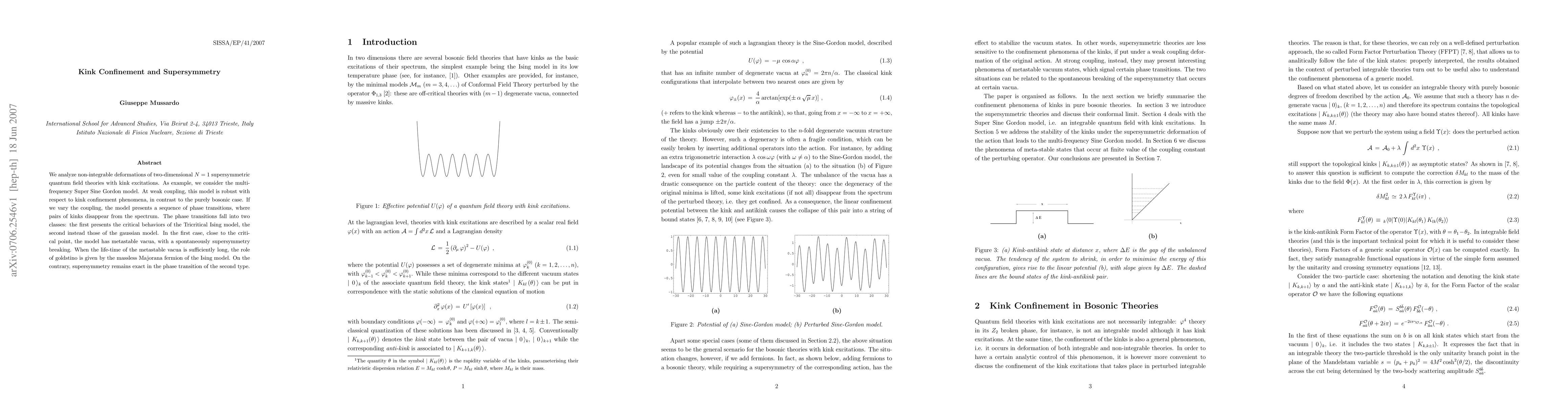 We analyze non-integrable deformations of two-dimensional N=1 supersymmetric quantum field theories with kink excitations. As example, we consider the multi-frequency Super Sine Gordon model. At weak coupling, this model is robust with respect to kink confinement phenomena, in contrast to the purely bosonic case. If we vary the coupling, the model presents a sequence of phase transitions, where pairs of kinks disappear from the spectrum. The phase transitions fall into two classes: the first presents the critical behaviors of the Tricritical Ising model, the second instead those of the gaussian model. In the first case, close to the critical point, the model has metastable vacua, with a spontaneously supersymmetry breaking. When the life-time of the metastable vacua is sufficiently long, the role of goldstino is given by the massless Majorana fermion of the Ising model. On the contrary, supersymmetry remains exact in the phase transition of the second type.