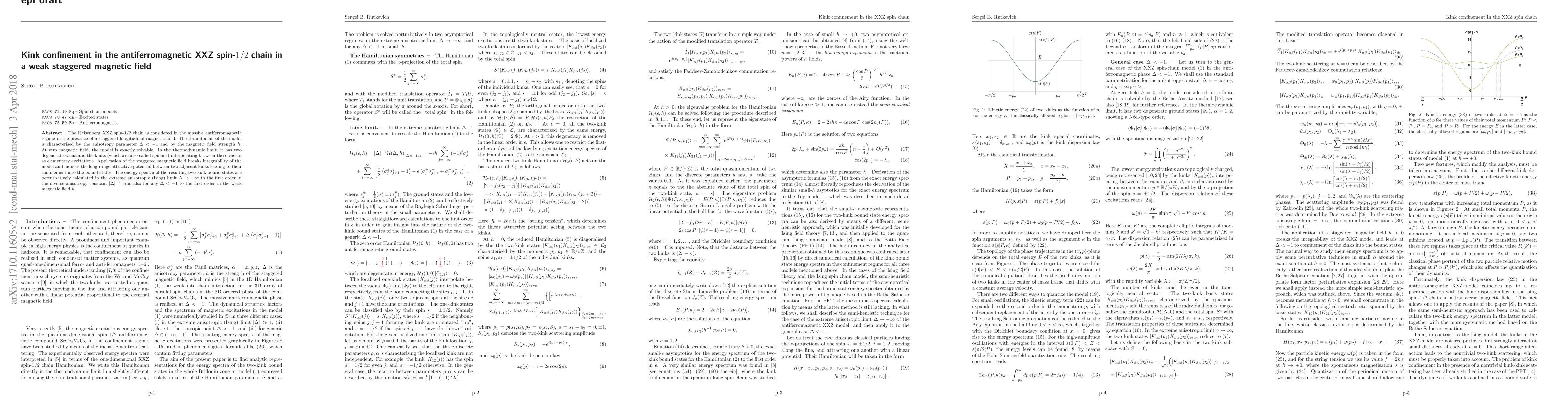 This paper investigates the effect of a staggered magnetic field on the antiferromagnetic XXZ spin-1/2 chain, focusing on the confinement of kinks (spinons) due to the induced attractive potential. Energy spectra of two-kink bound states are calculated perturbatively in the extreme anisotropic limit and for general values of the anisotropy parameter and weak magnetic field strength.