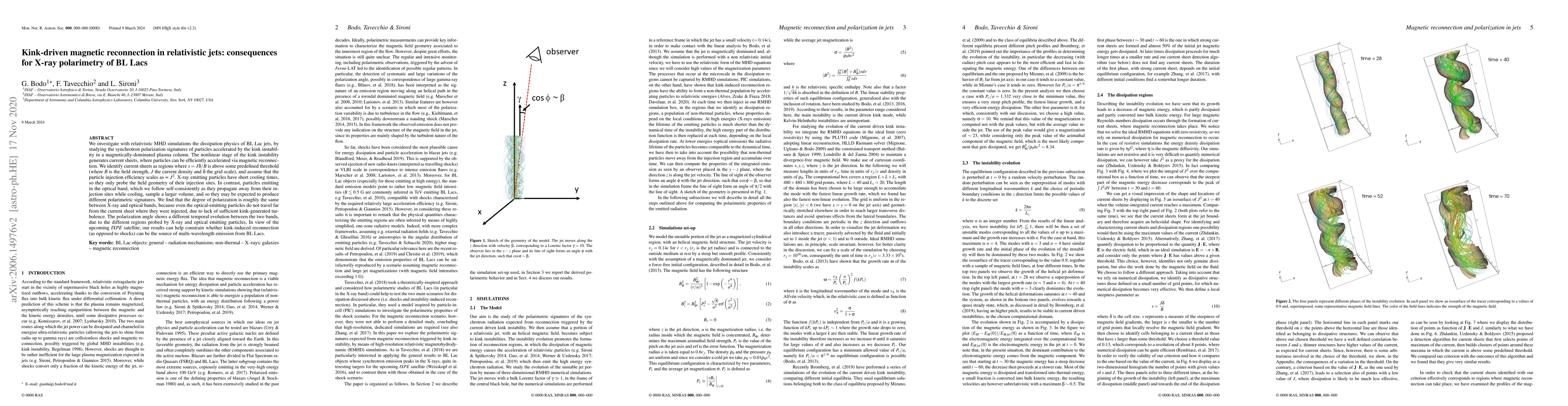 We investigate with relativistic MHD simulations the dissipation physics of BL Lac jets, by studying the synchrotron polarization signatures of particles accelerated by the kink instability in a magnetically-dominated plasma column. The nonlinear stage of the kink instability generates current sheets, where particles can be efficiently accelerated via magnetic reconnection. We identify current sheets as regions where s = J d/B is above some predefined threshold (where B is the field strength, J the current density and d the grid scale), and assume that the particle injection efficiency scales as proportional to the square of the current. X-ray emitting particles have short cooling times, so they only probe the field geometry of their injection sites. In contrast, particles emitting in the optical band, which we follow self-consistently as they propagate away from their injection sites while cooling, sample a larger volume, and so they may be expected to produce different polarimetric signatures. We find that the degree of polarization is roughly the same between X-ray and optical bands, because even the optical-emitting particles do not travel far from the current sheet where they were injected, due to lack of sufficient kink-generated turbulence. The polarization angle shows a different temporal evolution between the two bands, due to the different regions probed by X-ray and optical emitting particles. In view of the upcoming IXPE satellite, our results can help constrain whether kink-induced reconnection (as opposed to shocks) can be the source of multi-wavelength emission from BL Lacs.