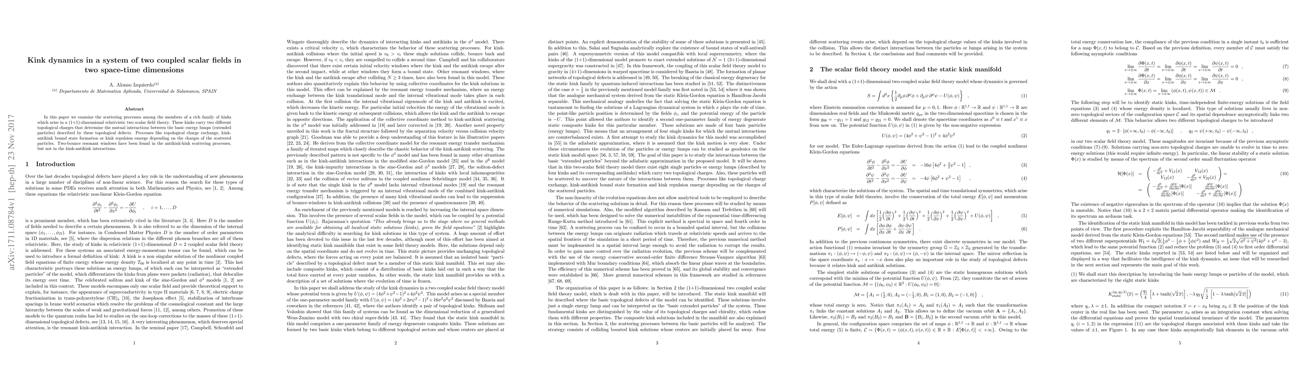 This paper investigates scattering processes among kinks in a (1+1)-dimensional relativistic two scalar field theory, revealing interactions like topological charge exchange and kink-antikink bound state formation, with two-bounce resonant windows observed in antikink-kink scattering but not in kink-antikink interactions.